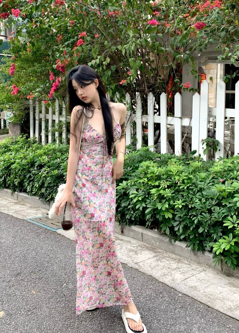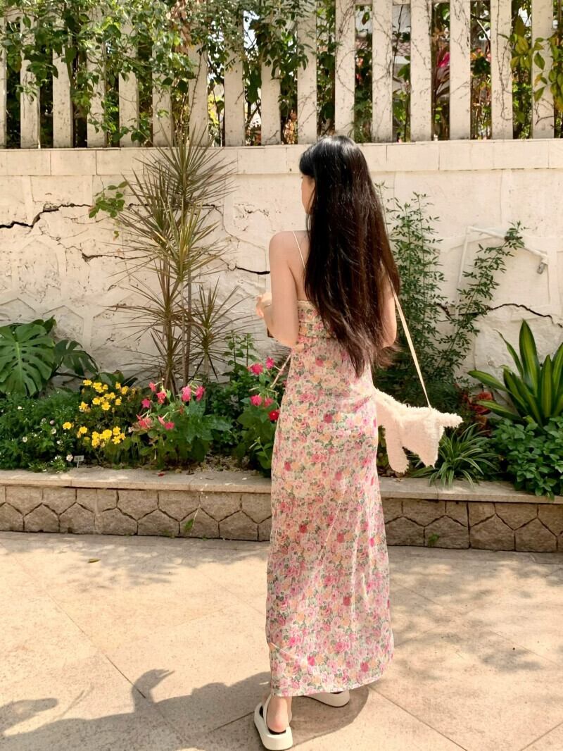レトロな花柄のレースのセクシーなサスペンダードレスの女性の春と夏のウエスト痩身スカートロマンチックな油絵スタイルのミドル丈スカート スプリング 春物 サマー 夏物 0921950785463935