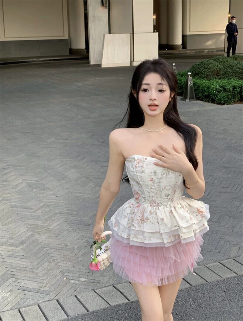 純粋な欲望スタイル年齢削減スーツスカート女性春 2024 新プリントフィッシュボーンチューブトップ痩身メッシュスカート 2 点セット スプリング 春物 0921924166895446
