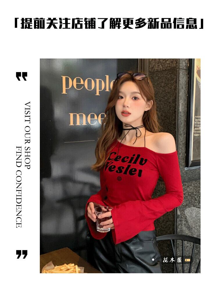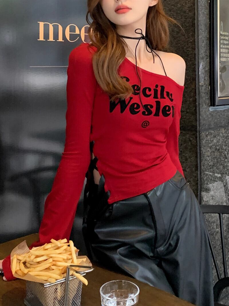 甘くてスパイシーな斜めショルダーストラップ長袖オフショルダー Tシャツ女性 2024 春の新しいスタイルの対照的なレタープリントショートトップトレンディ ロング 大人ガーリー スウィート キュート カジュアル スプリング 春物 0921985204694843