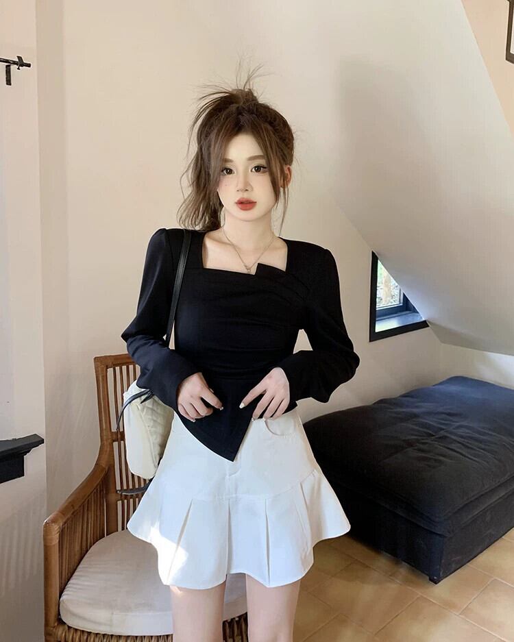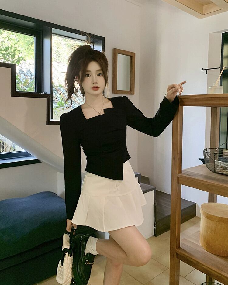 不規則な長袖右肩Tシャツレディース2024年春の新しいスタイルのニッチデザインスリムショートトップ ロング スプリング 春物 0921947979275509