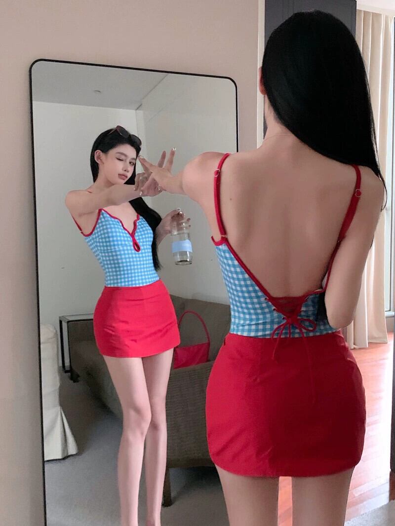甘くてスパイシーなホリデー背中の開いたブルーチェック柄サスペンダージャンプスーツ女性の夏のレトロな赤ヒップハグスカート 2 点セット レッド 大人ガーリー スウィート キュート カジュアル サマー 夏物 0921973957154707