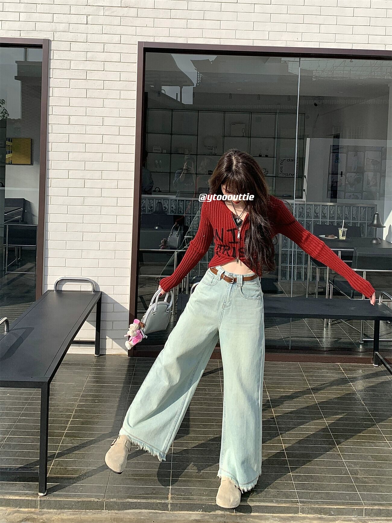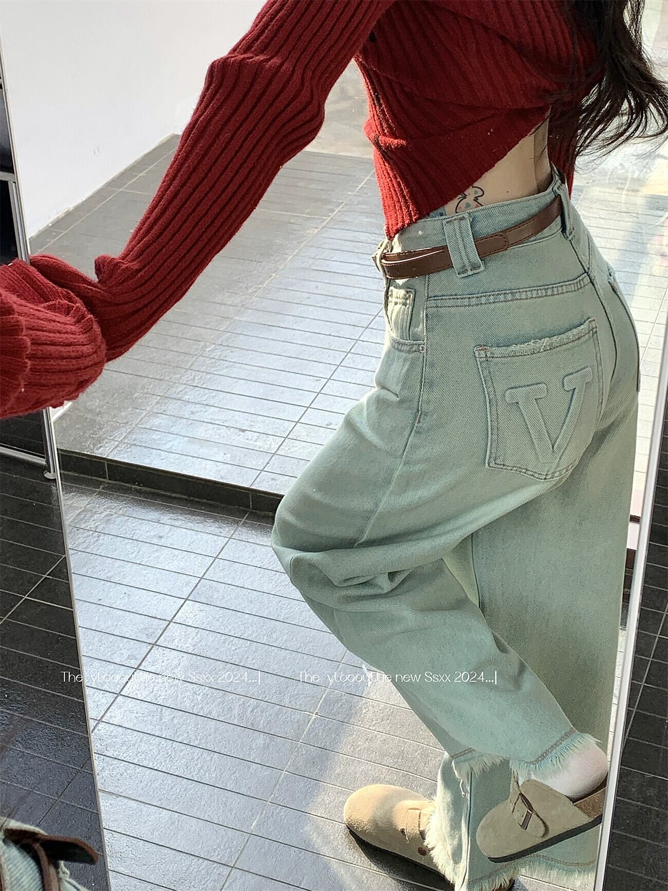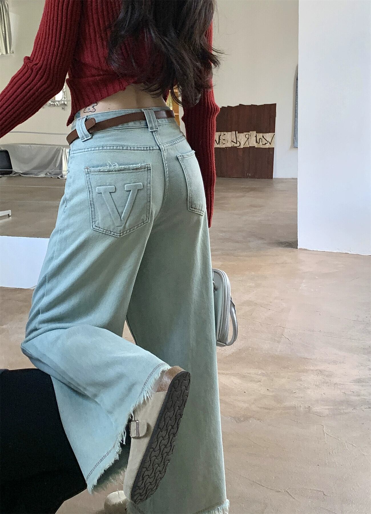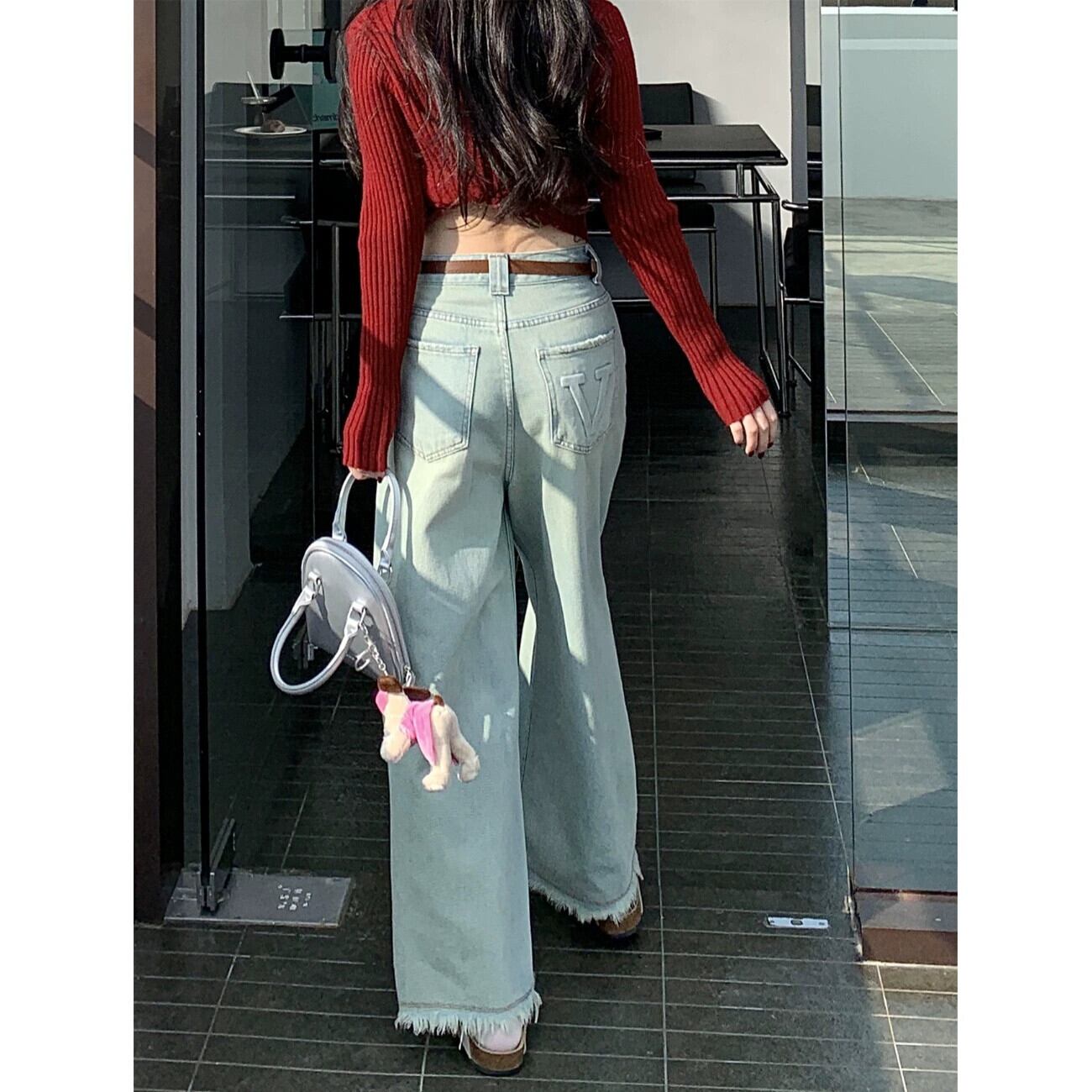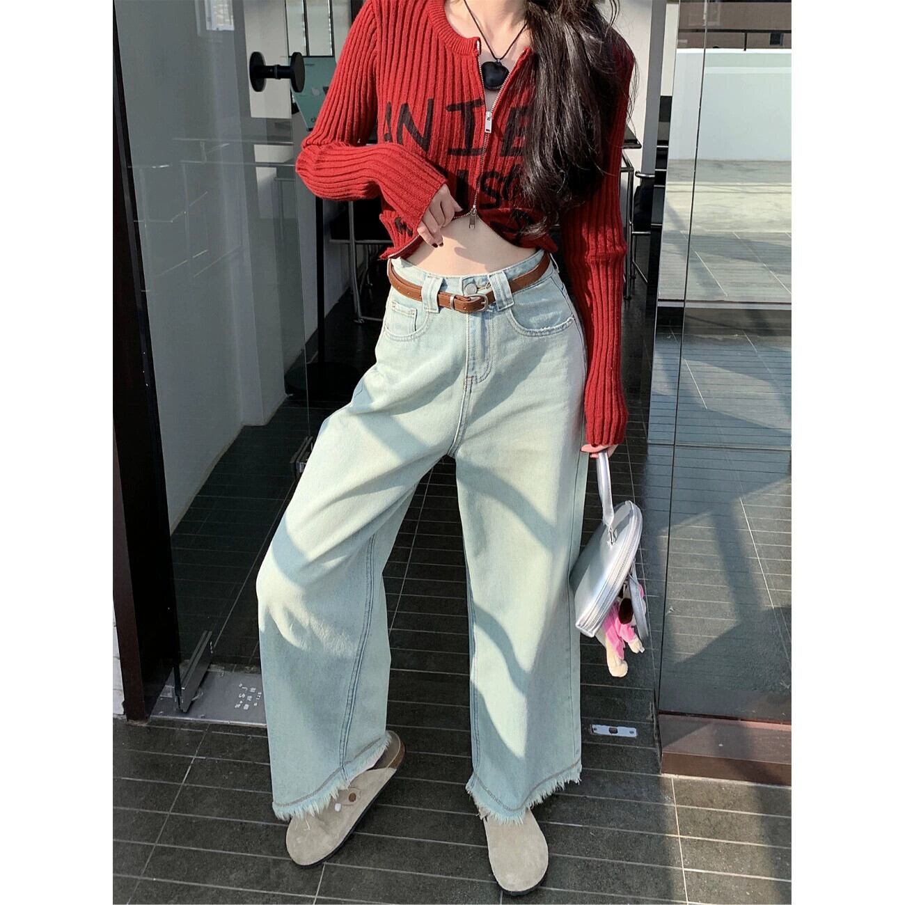 レトロなダメージ加工ライトブルーワイドレッグジーンズ女性春デザインローエッジパンツハイウエストルーズストレートパンツ ハイウェスト スプリング 春物 ワイドパンツ 0921996560281917