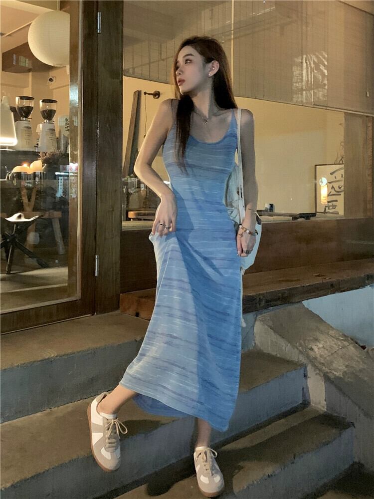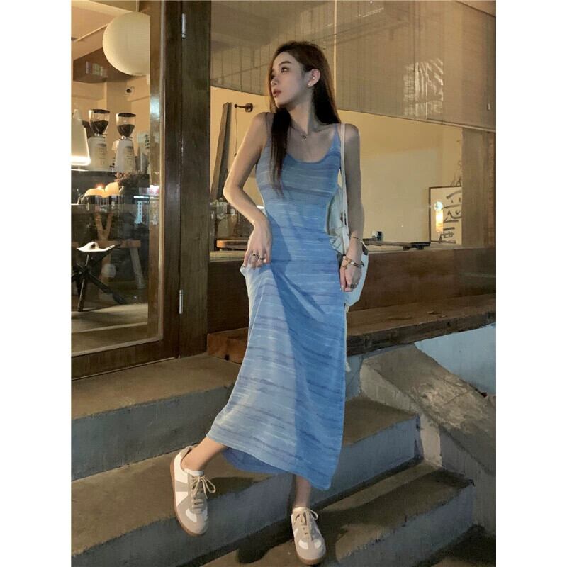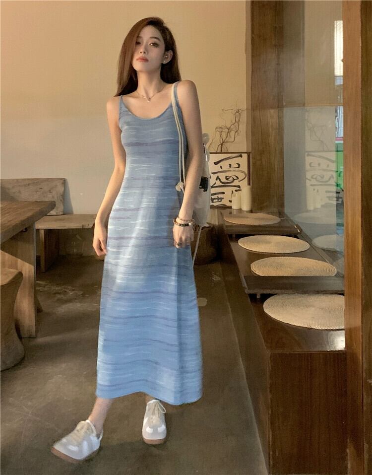ニッチコントラストカラーデザインホリデースタイルドレス女性夏 2024 新しいスタイルミッドレングススリムニットサスペンダースカート サマー 夏物 092194056066427
