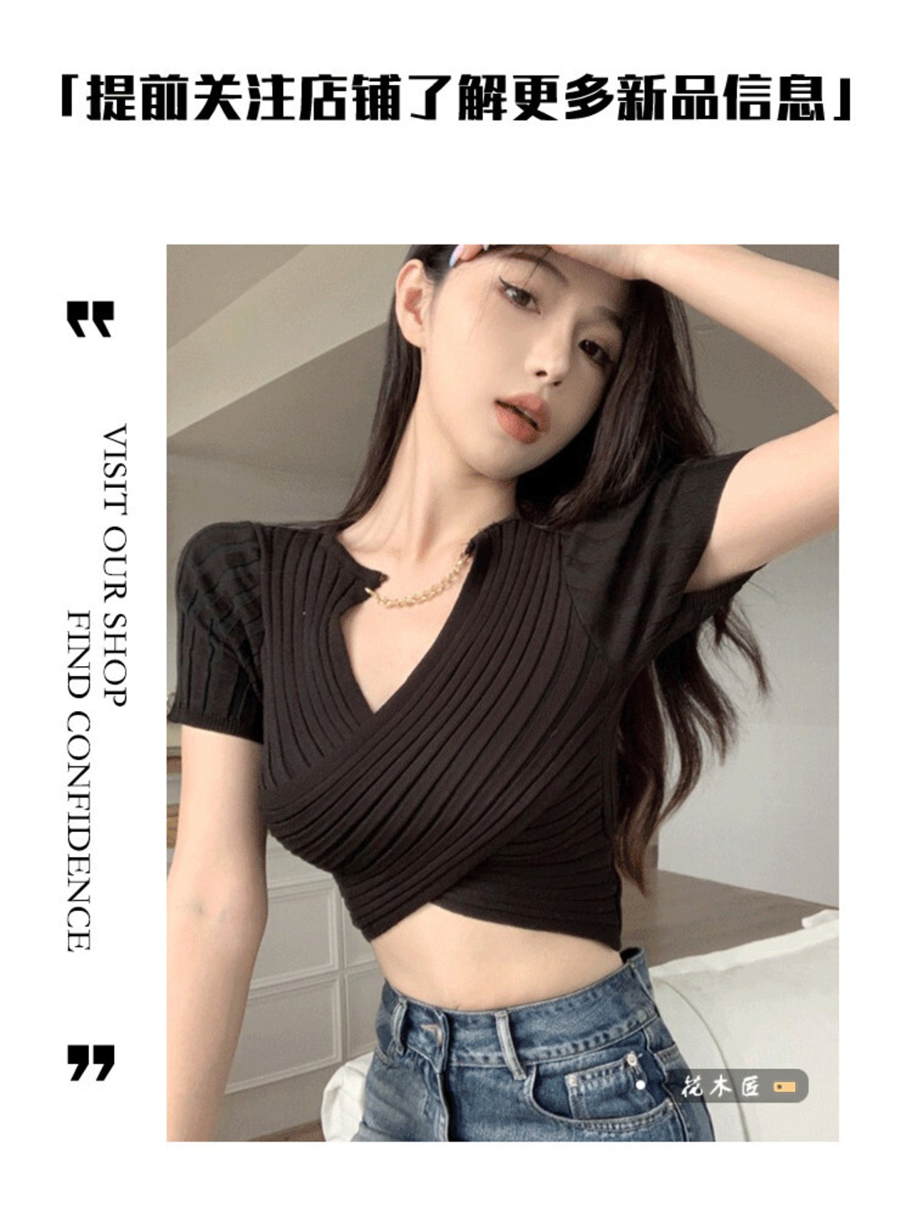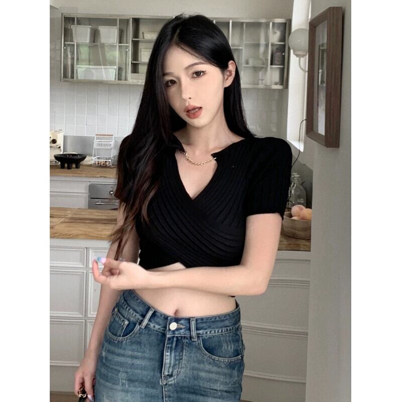 ホットクロス V ネック半袖セーター女性 2024 春の新しい純粋な欲望スリムフィット薄いへそ出しショートトップ スプリング 春物 Vネック ピュア 0921940454739895