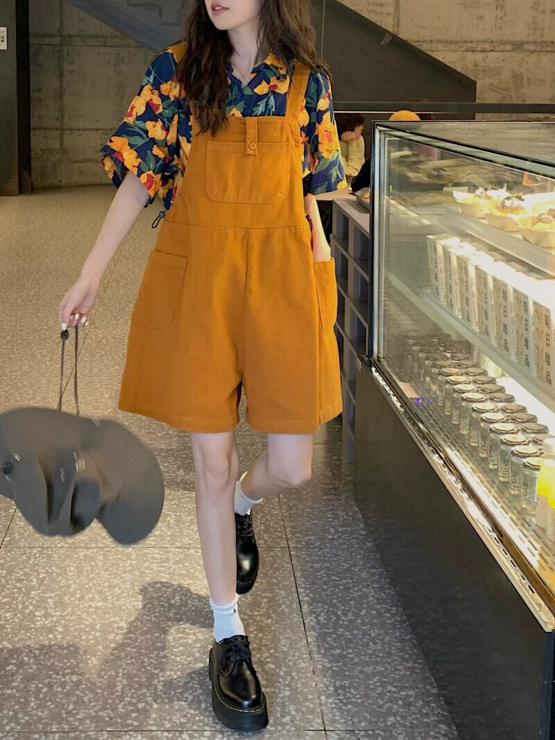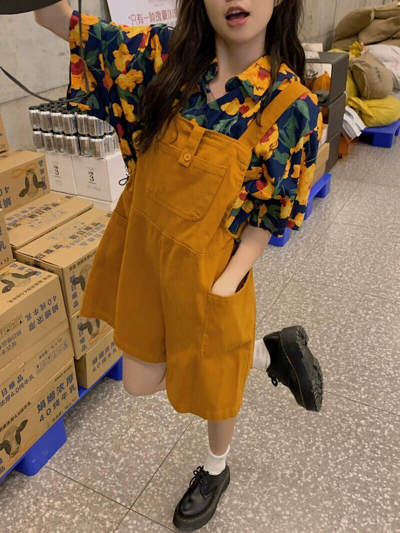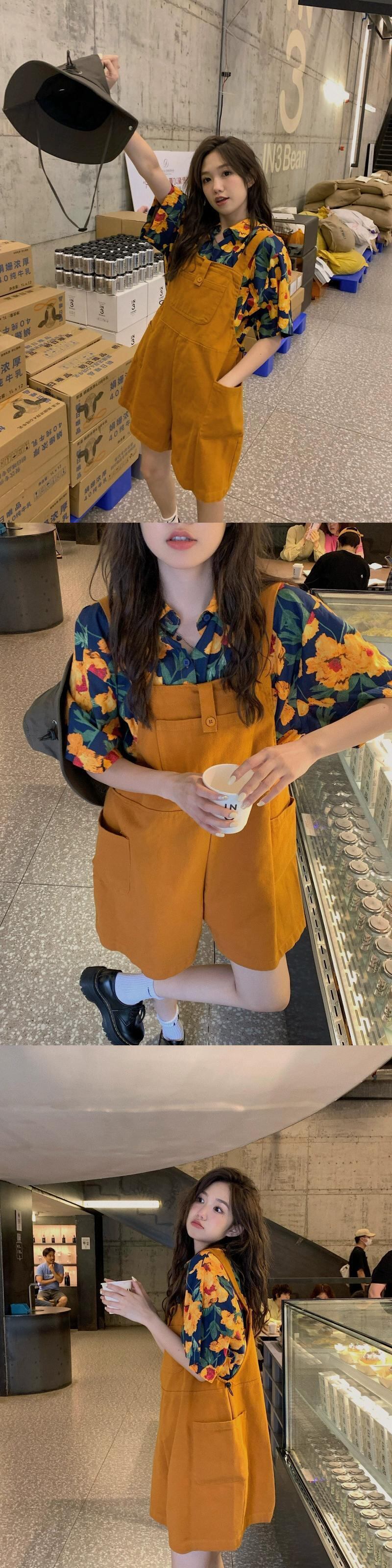 色:黄色い花のシャツ,カボチャのオーバーオール