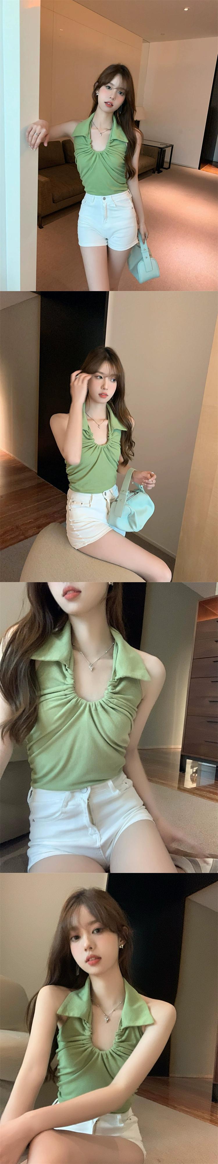 注意してください、スタイル背中の開いたホルターネックベスト女性夏 2024 新しいスタイルインターネットセレブファッションプリーツスリムショートトップ サマー 夏物 0921931533026915