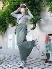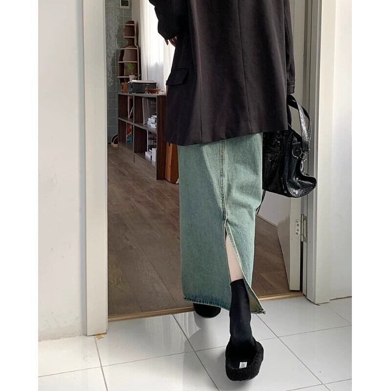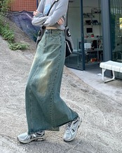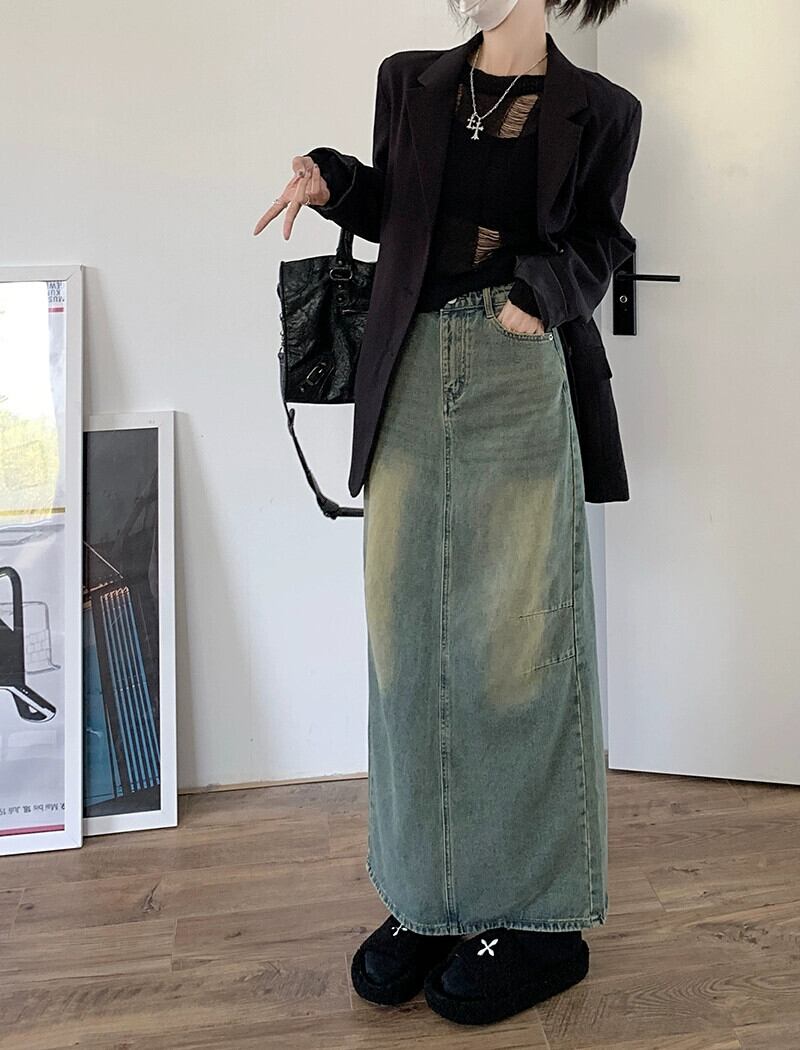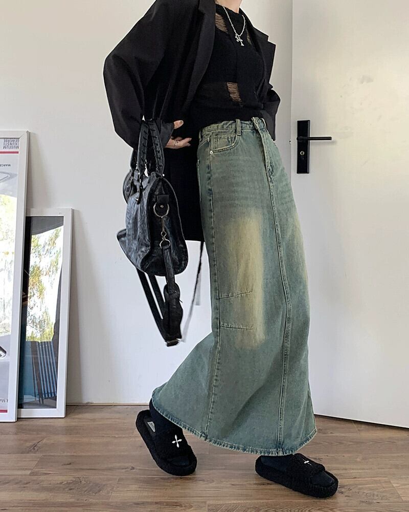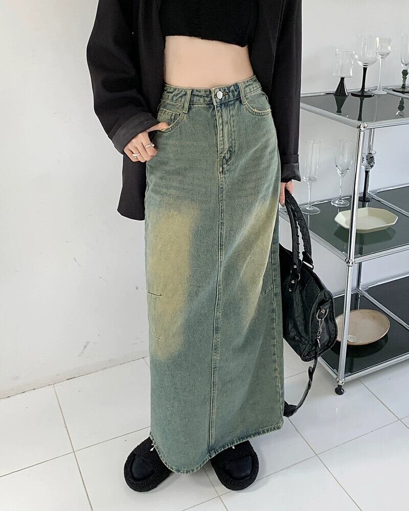 レトロなダメージ加工ライトカラーデニムスカートの女性の夏のリアスリットロングスカート小柄なハイウエスト痩身Aラインスカート ハイウェスト レッド サマー 夏物 0921983107949638