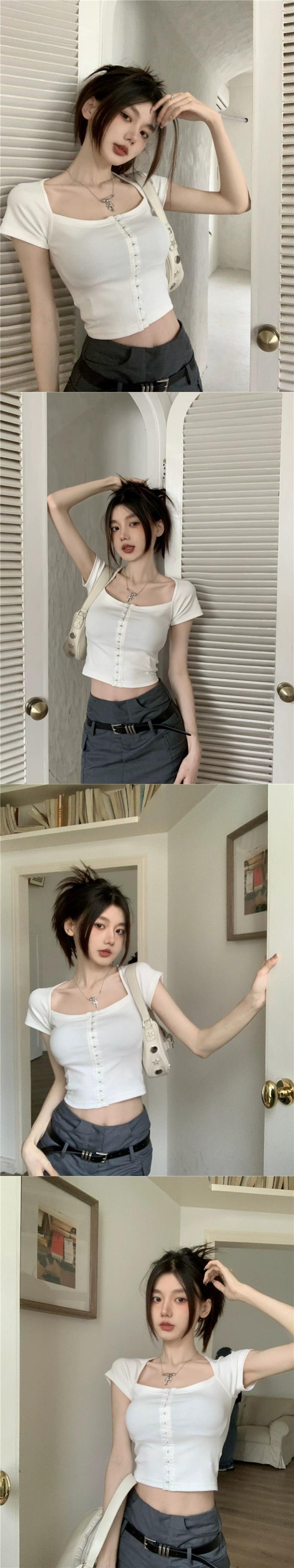 スクエアカラープルオーバー半袖 Tシャツ女性の夏の 2024 新デザインショートスタイル痩身インナートップ サマー 夏物 スクウェア 0921996539740449