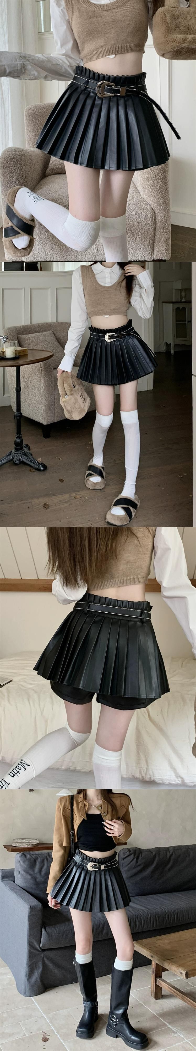 黒 pu レザープリーツスカート女性春 2024 新しい露出防止ハイウエストスリム a ラインショートスカート ブラック スプリング 春物 Aライン 0921923475915467