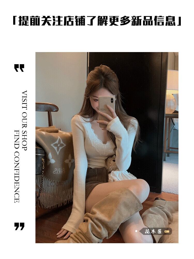 セクシーな純粋な欲望レース V ネック長袖 Tシャツ女性 2024 春の新しいスリムフィットインナーレイヤードショートトップ ロング レッド スプリング 春物 Vネック ピュア 0921968419834664