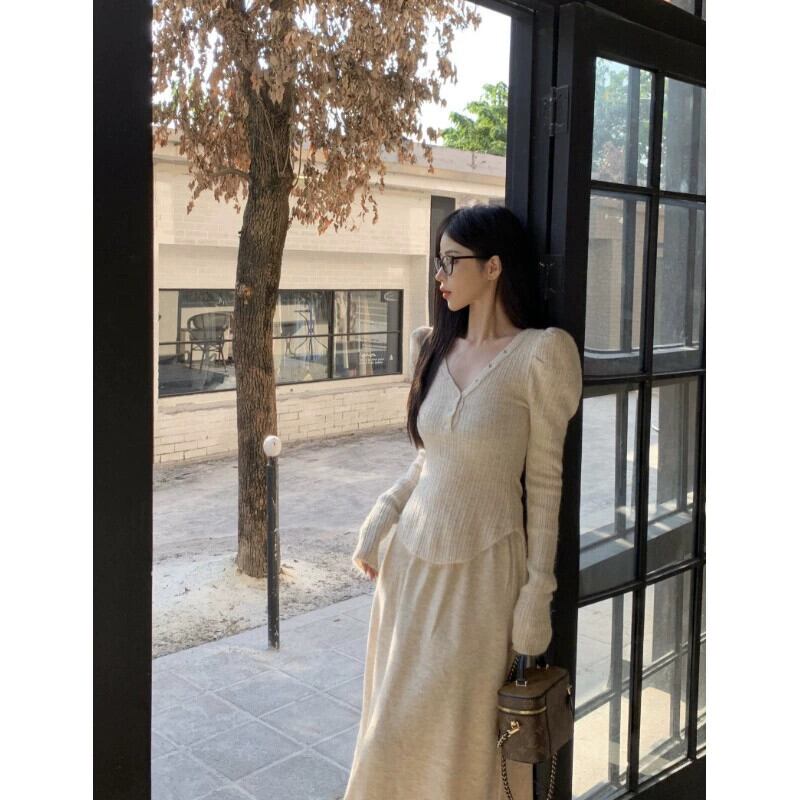 パフスリーブ長袖 V ネックスリムニットセータートップ女性秋冬優しいスーツ 5 分丈スカート 2 点セット ロング オータム 秋物 ウィンター 冬物 Vネック 0921950559587848