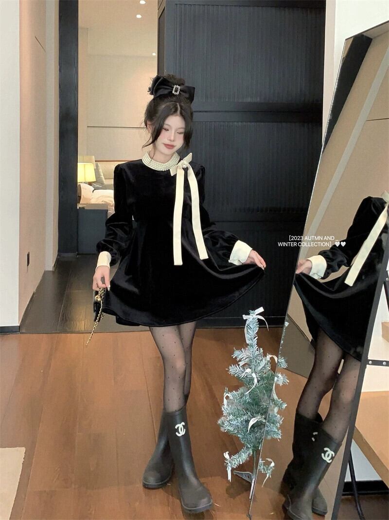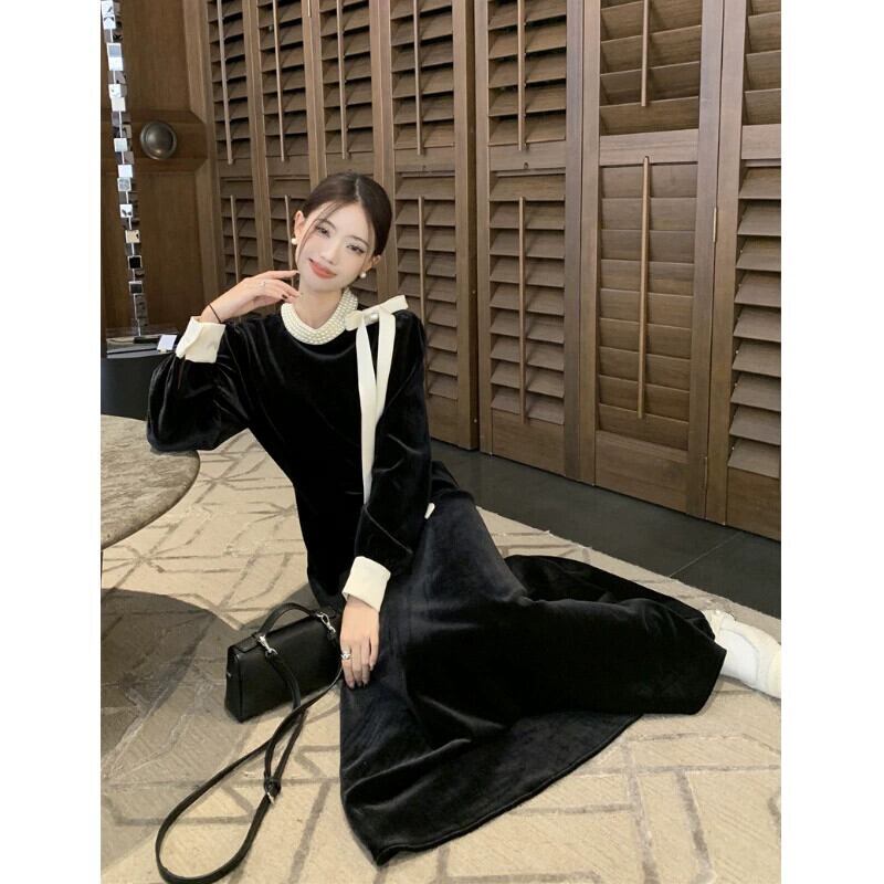 フレンチヘップバーンスタイル手作りビーズベルベットドレス女性春 2024 新年齢削減弓ウエストウエストスカート リボン スプリング 春物 0921980459253238