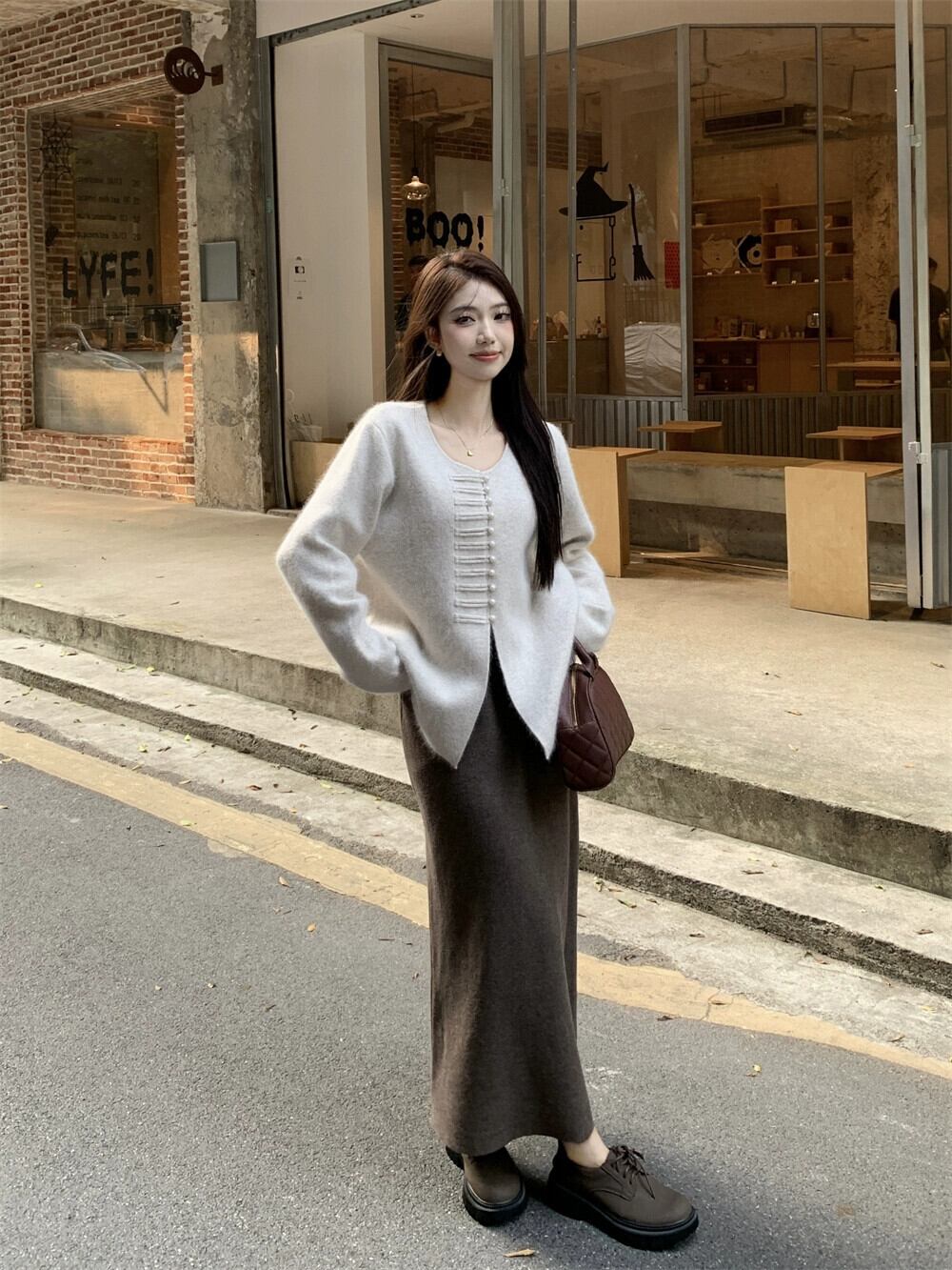 気質スーツスカート女性の春 2024 中国風ディスクボタンセータースカート 2 点セット スプリング 春物 0921937777670419