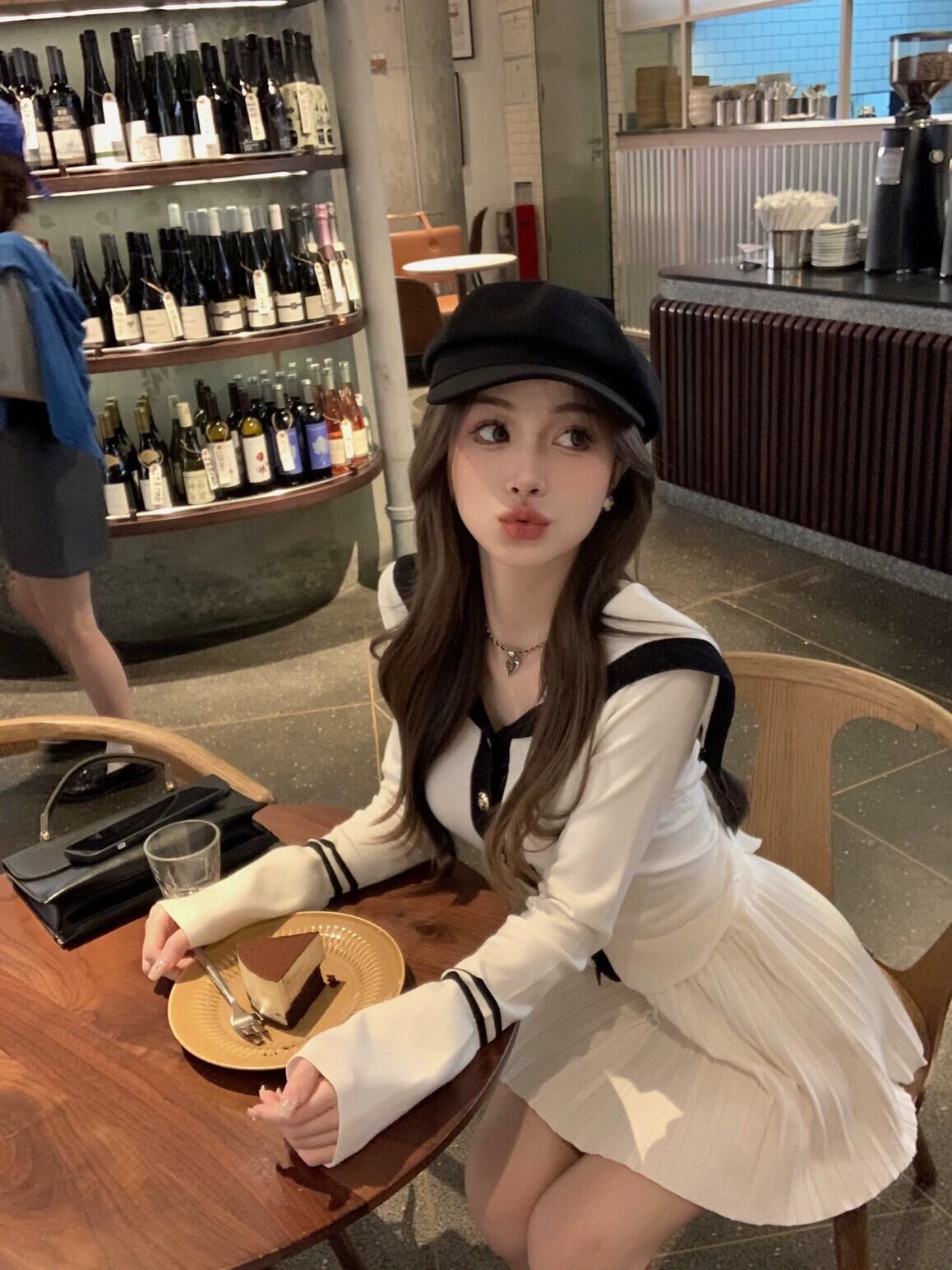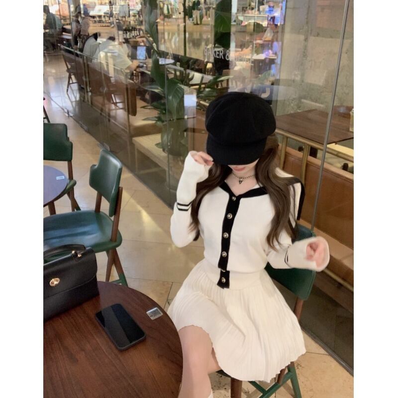 年齢を減らす小柄なカレッジスタイルのツーピースセット女性 2024 年春の新しいネイビーカラーニットトップとスカートスーツ スプリング 春物 0921978752568739