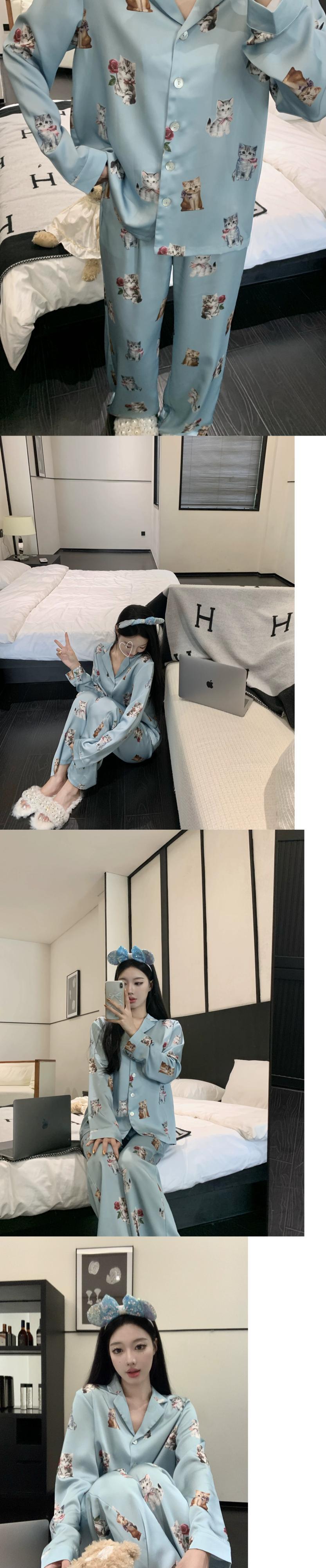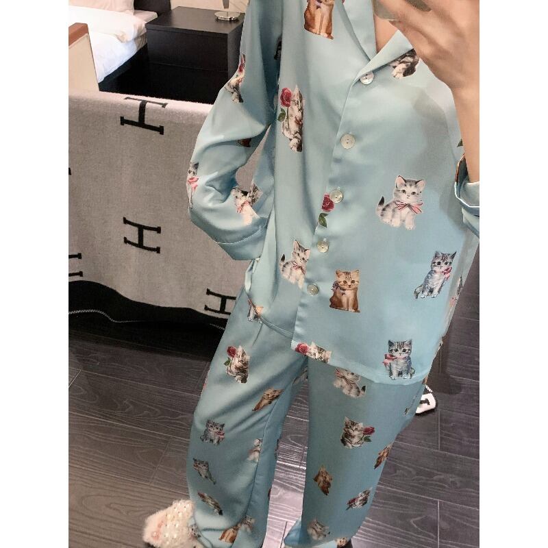 スタイルイン猫プリント長袖パジャマセット女性の春カジュアルワイドレッグパンツホームウェア 2 点セット ロング スプリング 春物 0921946291731911