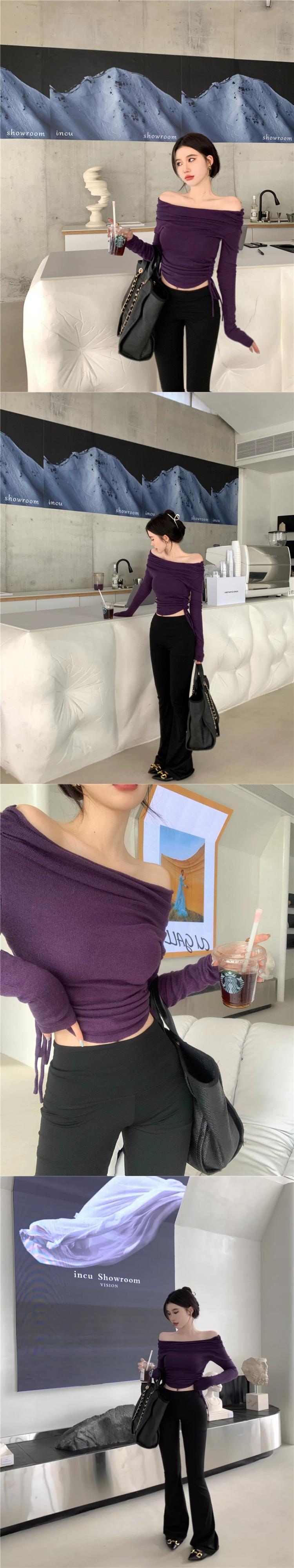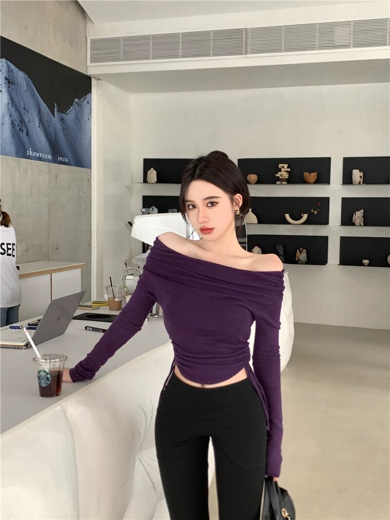 巾着デザインワンショルダー長袖セーター女性 2024 春の新スタイルショートスリムフィットボトリングトップ ロング スプリング 春物 S92199609323478