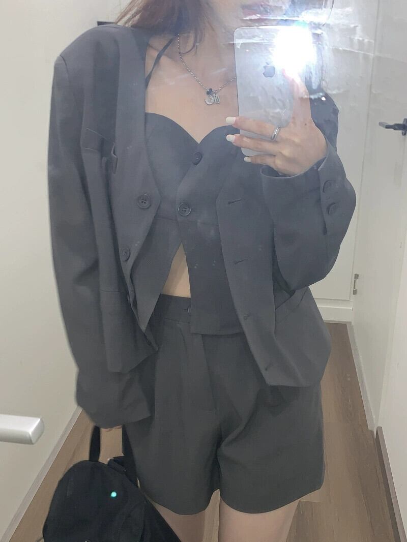 有能なスーツの女性の夏 2024 新しいグレースーツジャケットホルターネックベストワイドレッグショーツ 3 点セット サマー 夏物 ブルマー ワイドパンツ S921978005641913