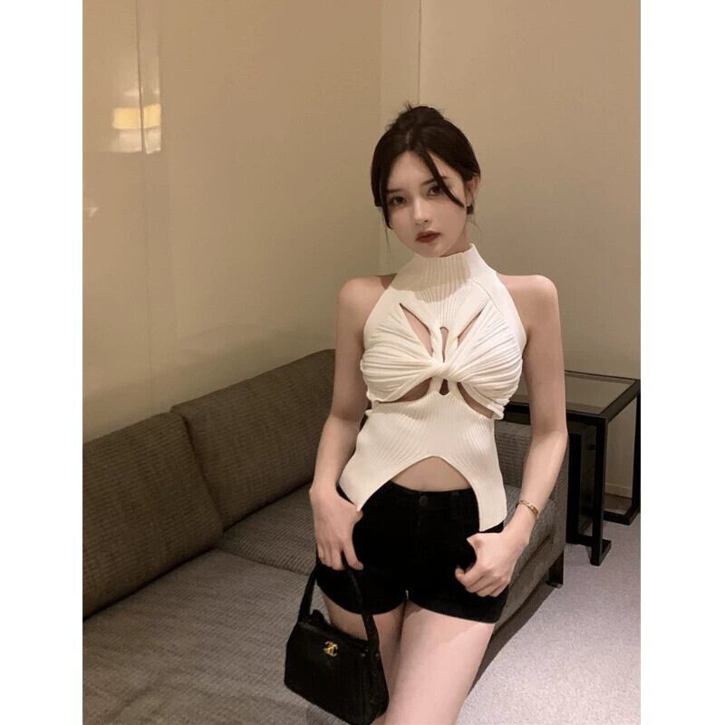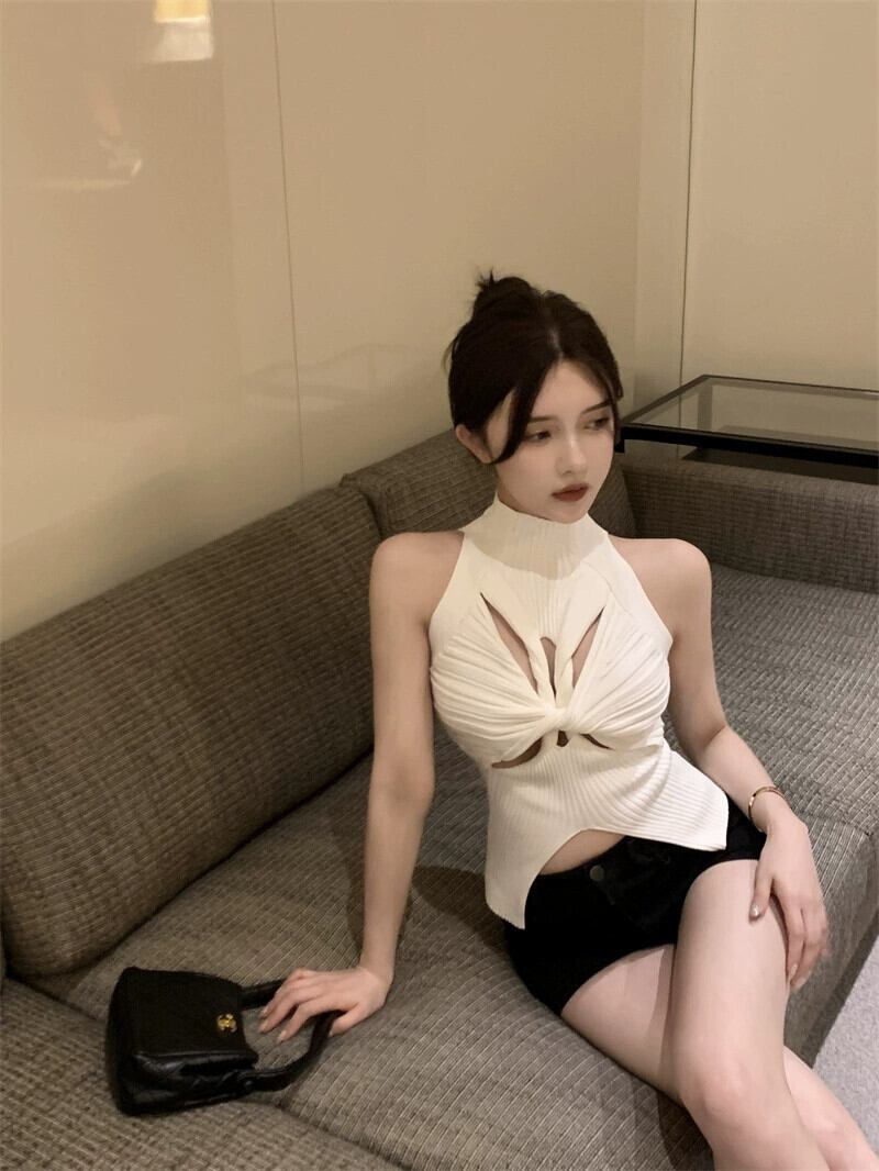甘いクールホットガールノースリーブニットベスト女性の夏 2024 不規則な中空セクシーなショートボトリングトップ 大人ガーリー スウィート キュート カジュアル サマー 夏物 S921928059809578