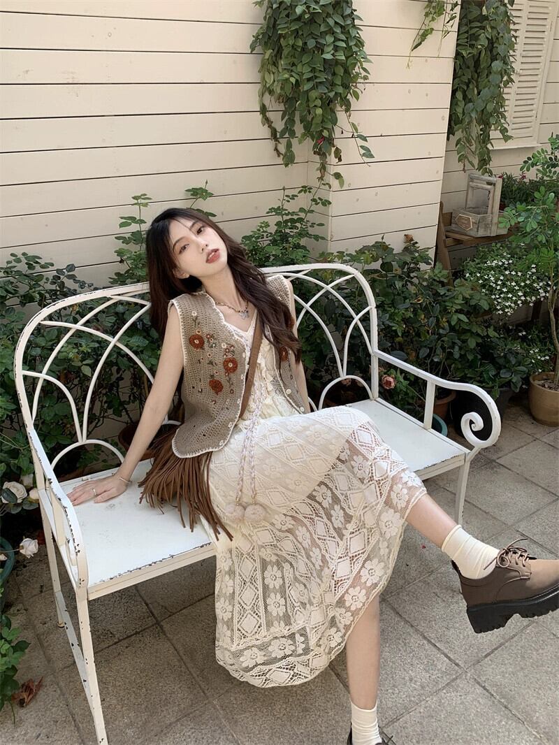 色:刺繍入りかぎ針編みベスト,透かし彫りニットカーディガン,フリンジメッシュスリップドレス