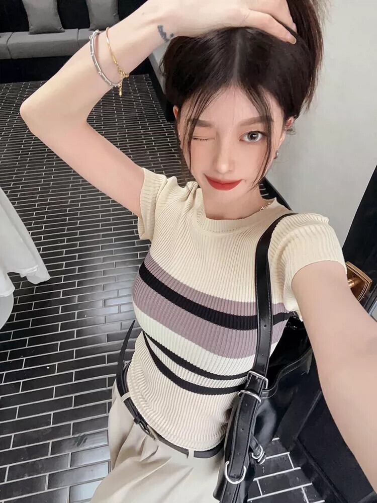 アメリカンスタイルのコントラストストライプ半袖セーター女性の夏の2023新しいスリムスリムファッショントップ サマー 夏物 S921956188444500
