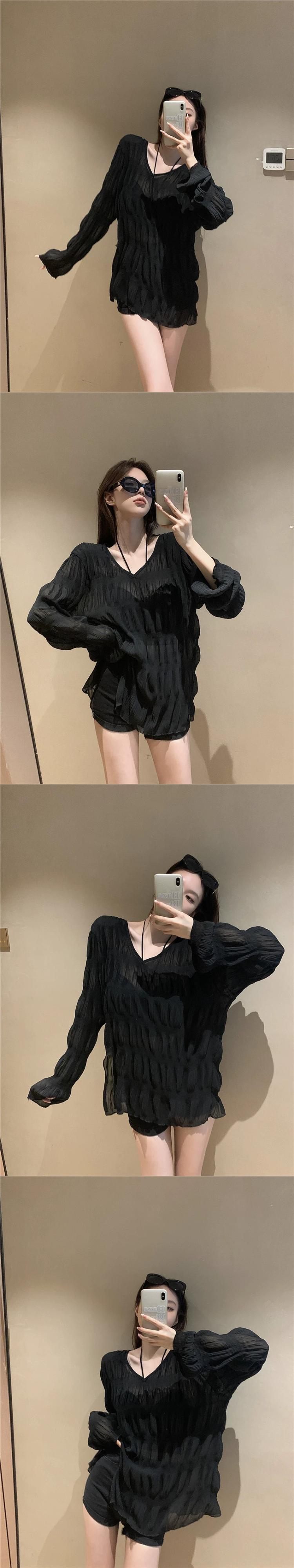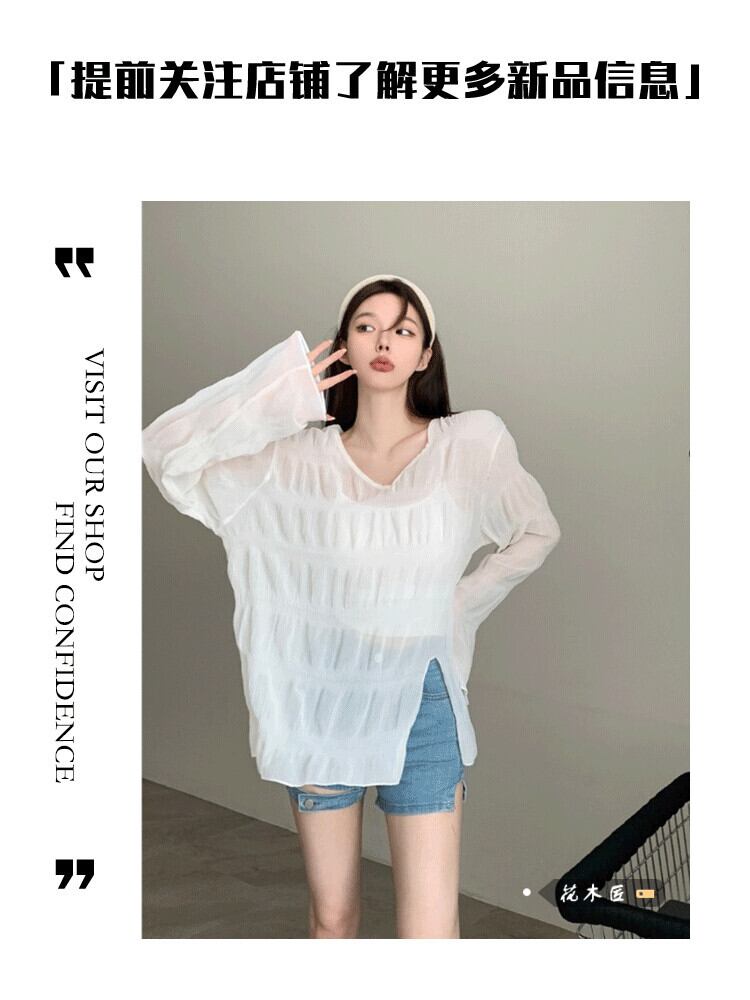 ED 薄いプリーツ V ネック日焼け止め Tシャツ女性の夏 2024 新しい多用途ミッドレングスのルーズでスリムなトップ サマー 夏物 Vネック S921999758667246