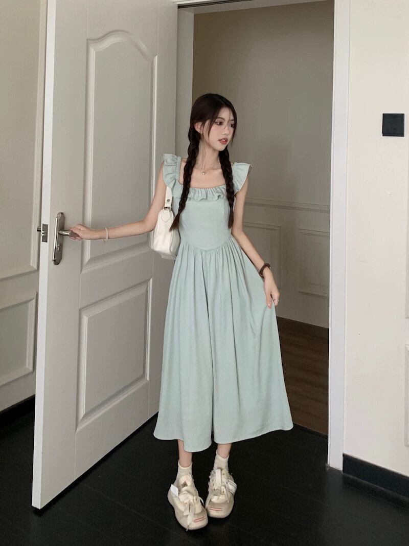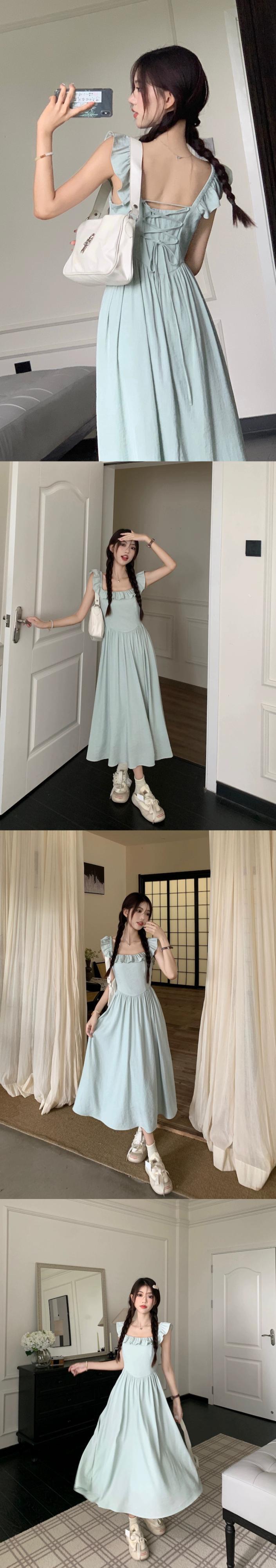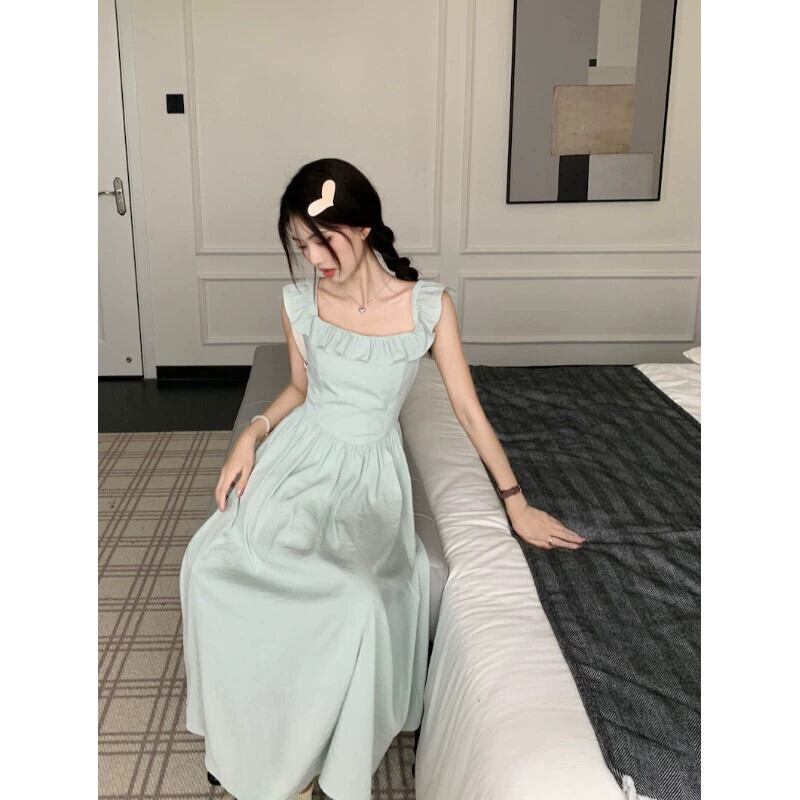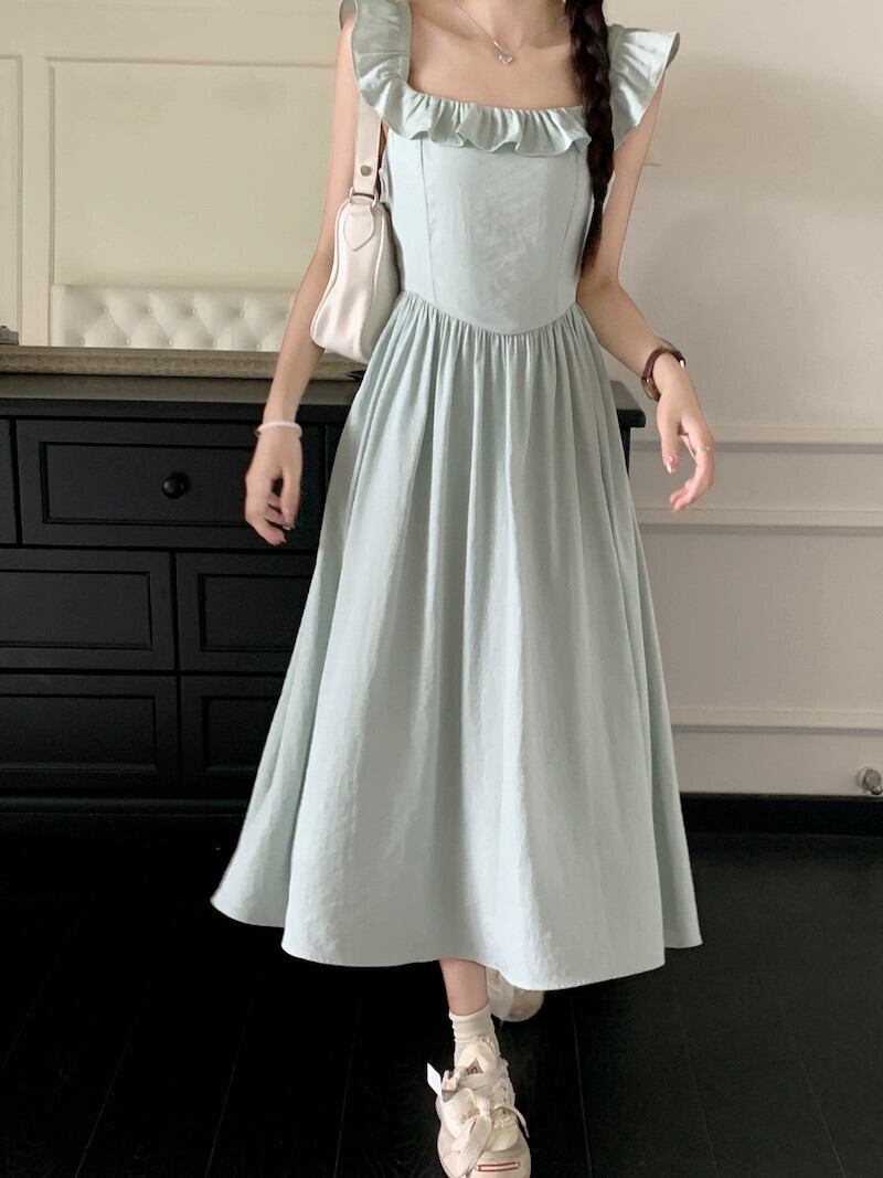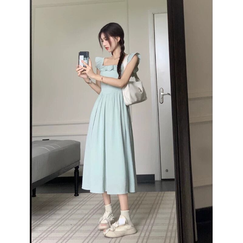 フランスのハイエンド小さなフライングスリーブスクエアネックドレスの女性の夏 2024 新しいスタイルの気質ウエスト痩身ミッドレングススカート サマー 夏物 スクウェア S921967853155137