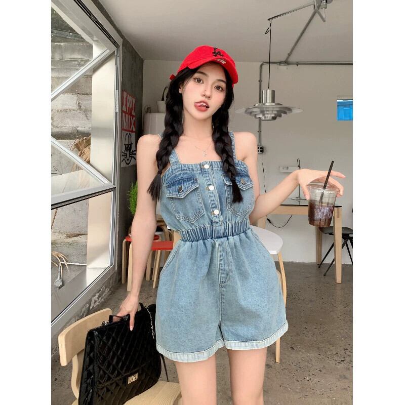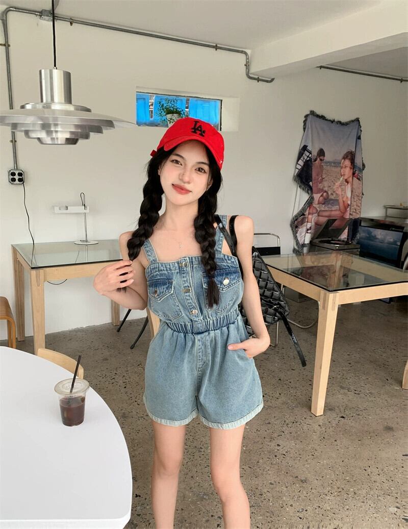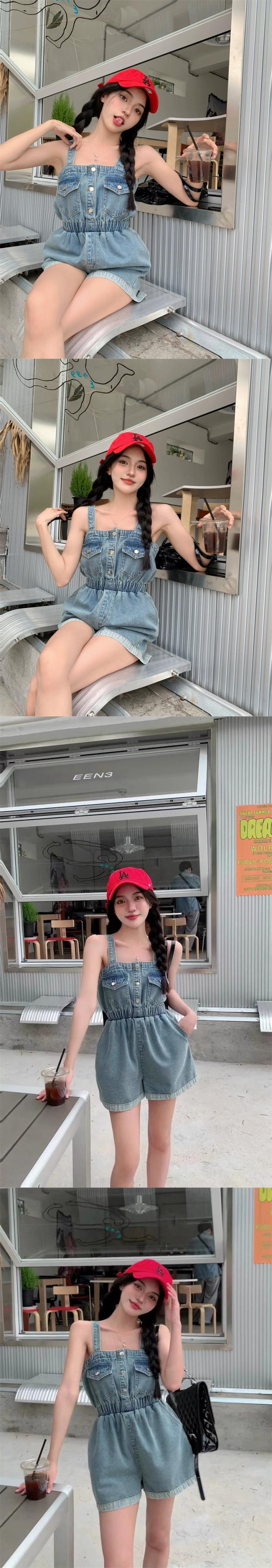 レトロカールワークウェアワンピースジーンズ女性夏 2024 新しい多用途カジュアルワイドレッグサスペンダーショーツイン サマー 夏物 ブルマー S921950932960023