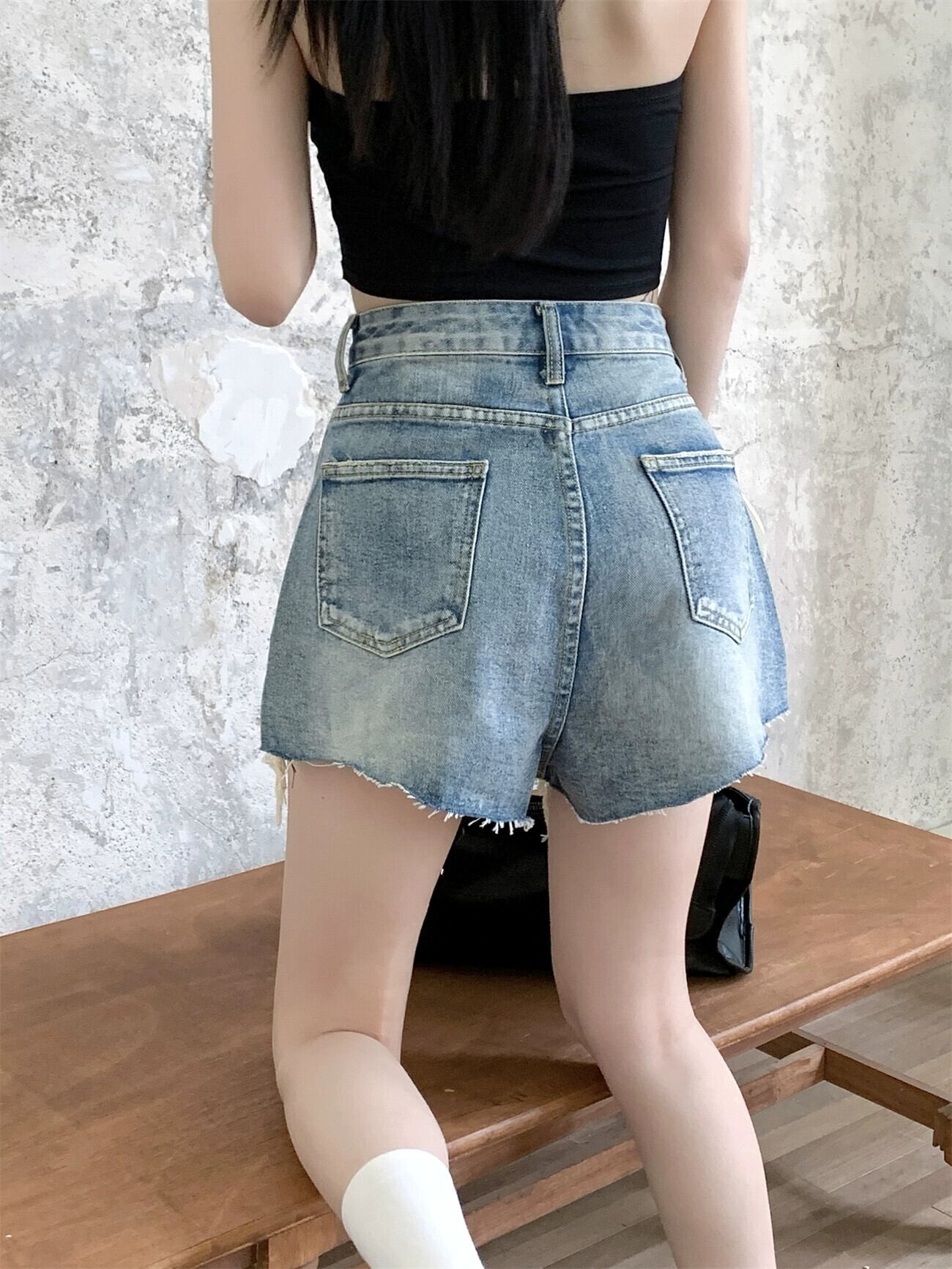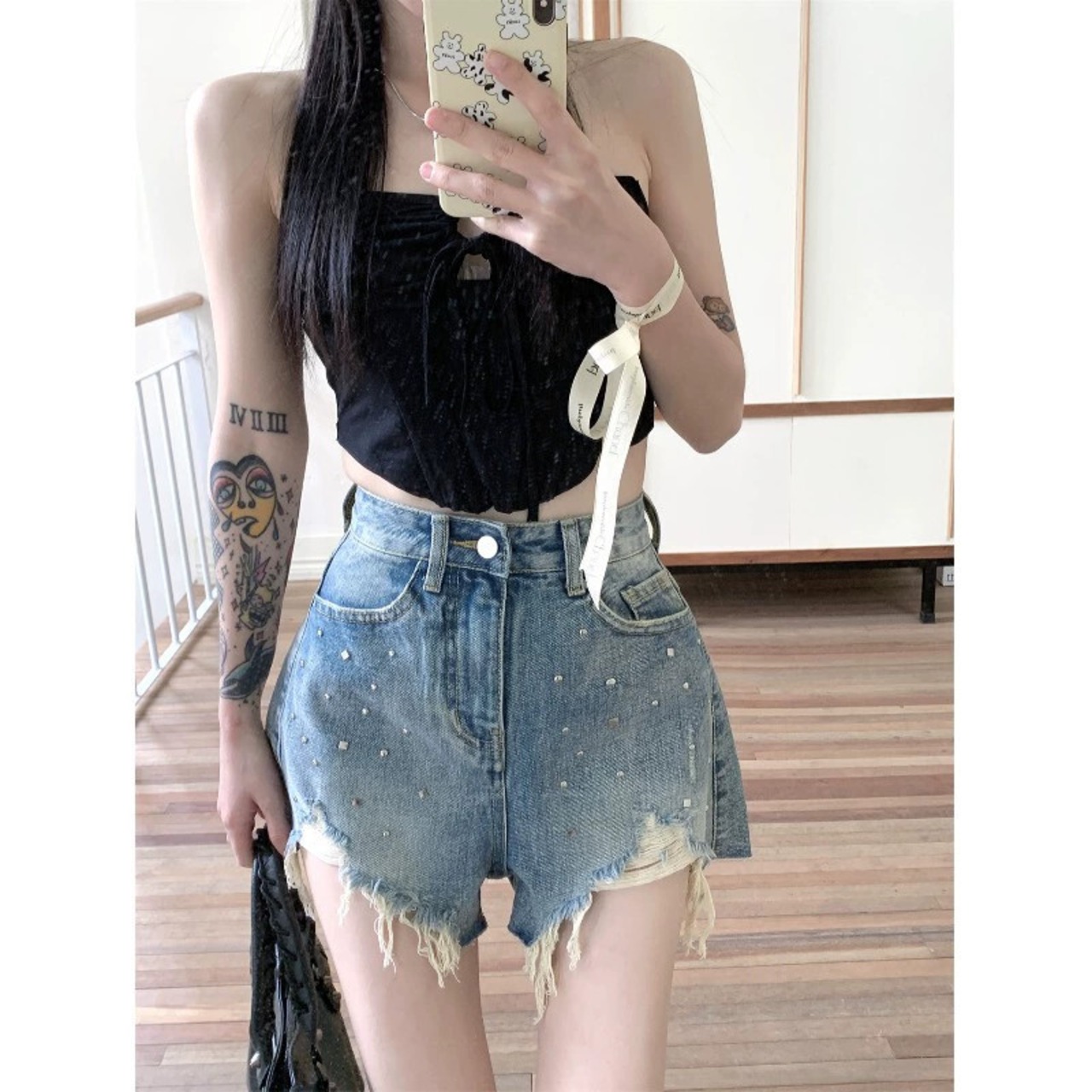 ニッチデザインビーズローエッジデニムショートパンツレディースサマーパンツルーズハイウエストワイドレッグスリムパンツ 夏物 ショーツ ブルマー S921977128213076