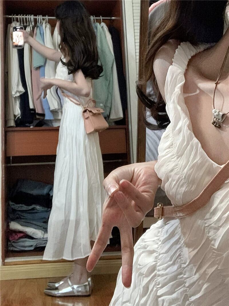 プリーツサスペンダードレス女性の夏のニッチ白妖精ロングスカート気質ウエストハイエンドスカート ホワイト サマー 夏物 S921977114254261