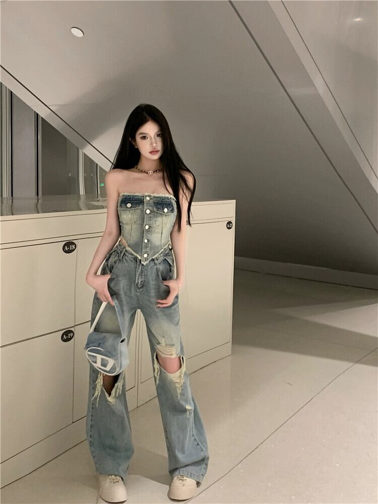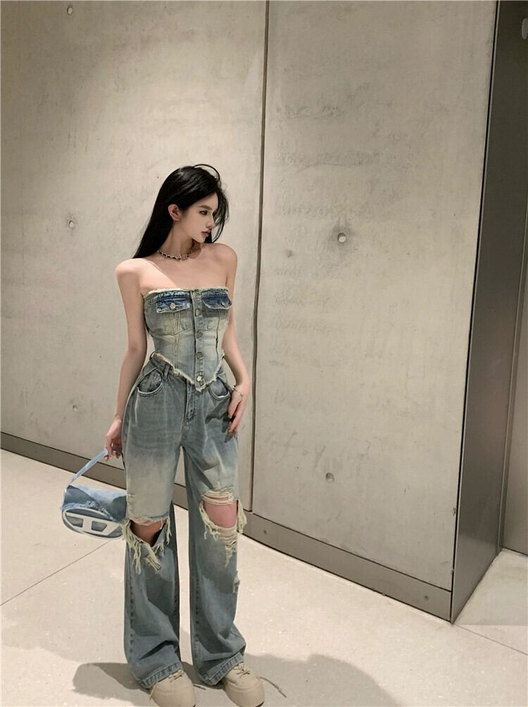 ホットデニムファッションスーツ女性夏 2024 新しいショートチューブトップトップハイウエストスリムパンツ 2 点セット ハイウェスト サマー 夏物 S921975256795849
