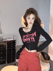 アメリカのプリント長袖 Tシャツ女性の夏 2024 新しいセクシーなショートスリムスリムジッパートップイン ロング サマー 夏物 S921976197891814