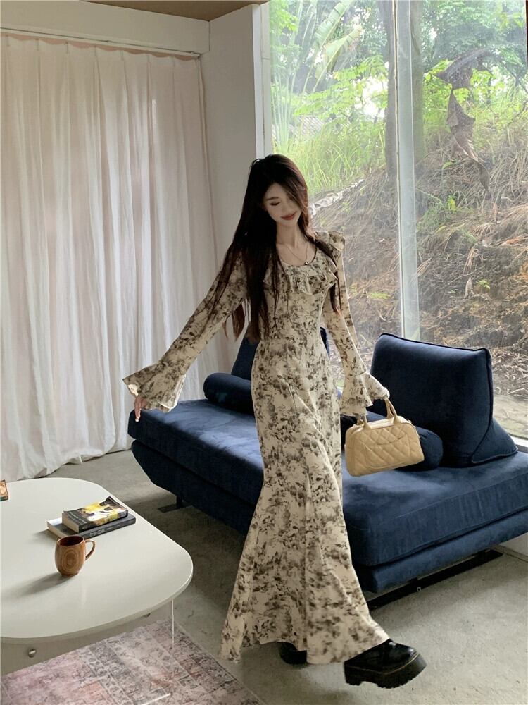 フレンチスタイルの花長袖ドレスの女性の夏 2024 新しいスタイルフリルデザインウエストロングスカート サマー 夏物 花柄 S921980205813859