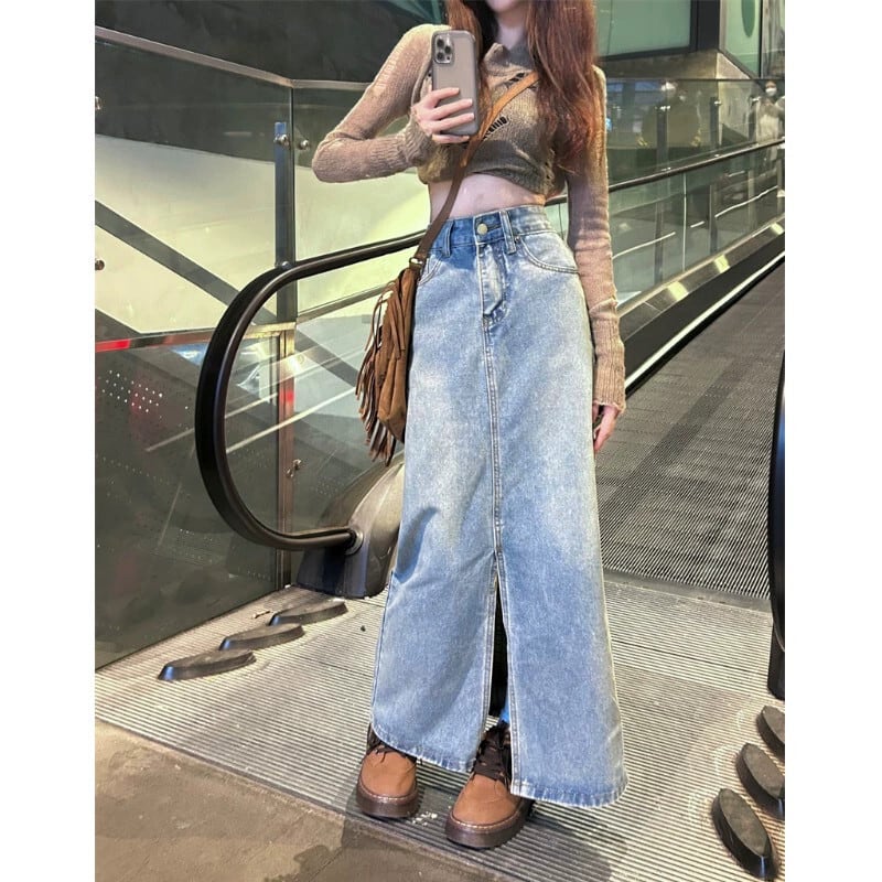 レトロスリットデニムスカート女性の夏の 2024 新しいスカートデザインニッチミッドレングスヒップハグスカート サマー 夏物 S921956055052508