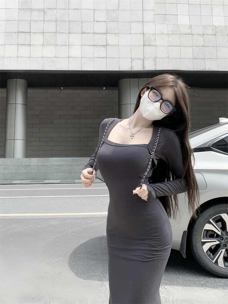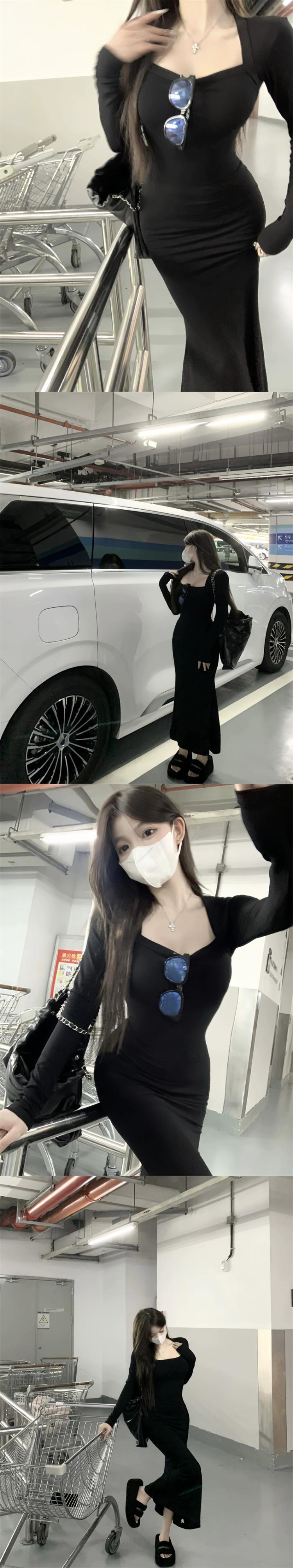 セクシーなホットガールスクエアネック長袖ドレス女性夏 2024 スリムフィットミッドレングスヒップフィッシュテールスカート ロング サマー 夏物 スクウェア S921960201242867