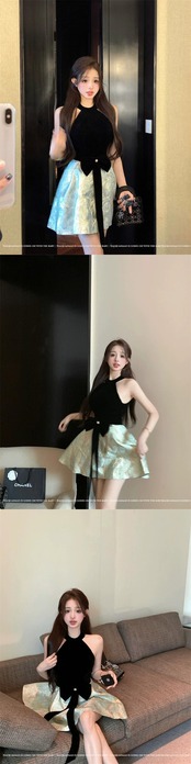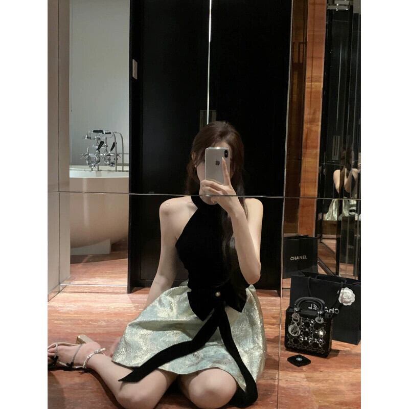 フレンチスタイルの小さな香りのよいスタイルのホルターネックドレスの女性の夏 2024 新しいスタイルの弓ウエスト痩身スプライシングスカート リボン サマー 夏物 S921911769006475