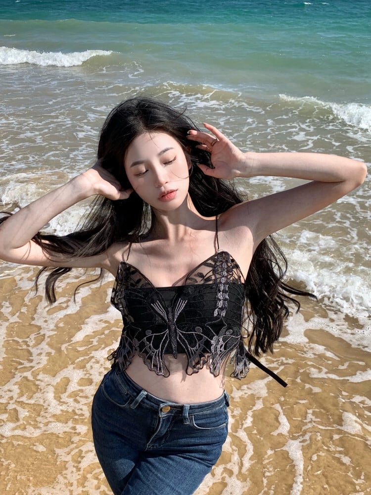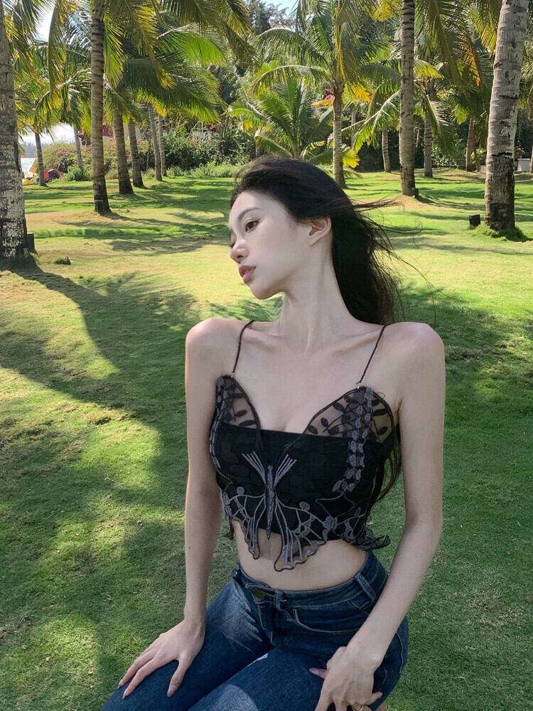 純粋な欲望セクシーな黒のレース刺繍蝶ベスト女性の夏 2024 ホットガールスタイルスリムキャミソールトップ レッド ブラック サマー 夏物 S921959381359263