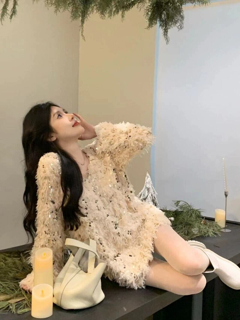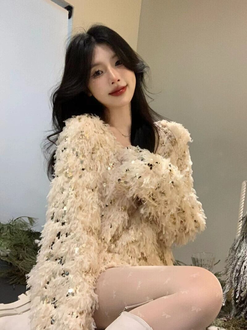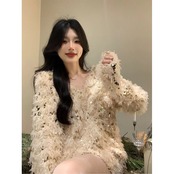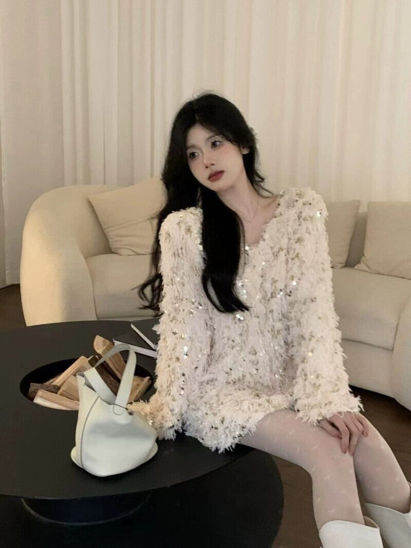 -エンドスプライシングスパンコール付きVネック長袖セーターレディース、春の気質、ルーズなデザイン、ニッチニットトップ ロング スプリング 春物 S921934118783090