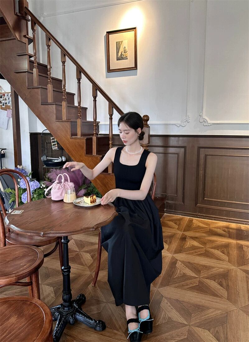フレンチスタイルニッチスプライシングノースリーブドレス女性の夏2024新しいスタイルウエスト痩身黒ベストロングスカート ブラック サマー 夏物 S921997646496664