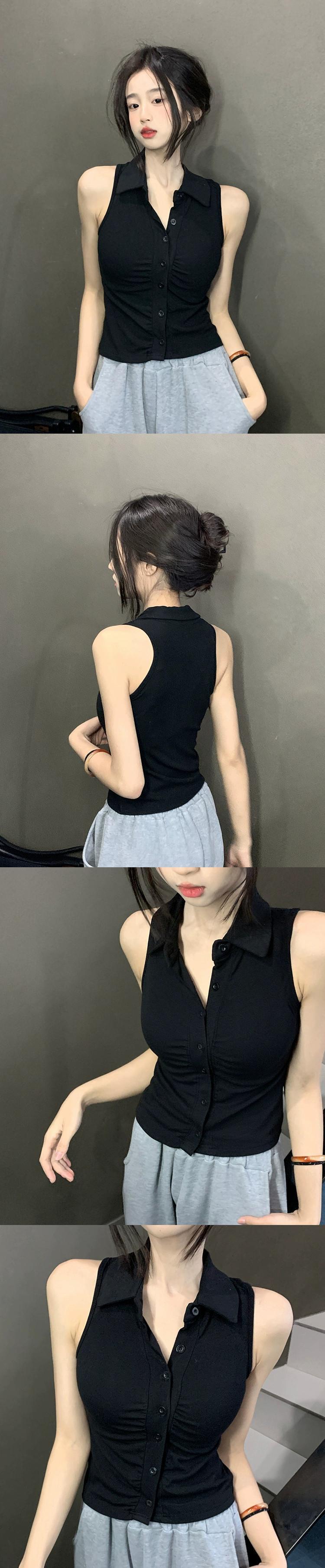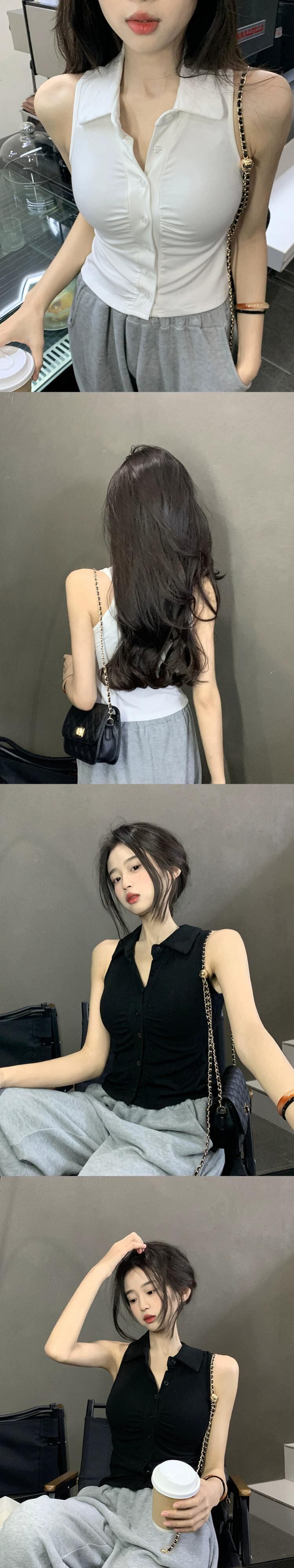 バージョン無地多用途ポロカラーノースリーブベスト女性夏 2024 新しいスリムフィットボトミングカーディガントップ サマー 夏物 ソリッドカラー S92193481029724