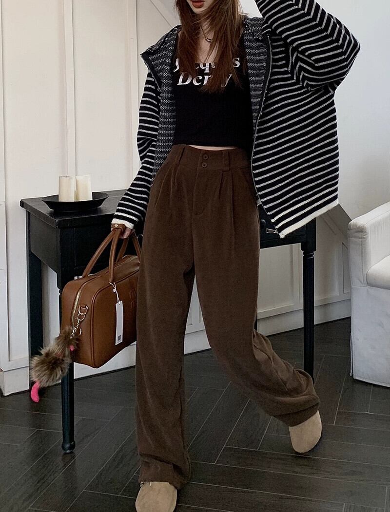 メイラードコーヒーレトロコーデュロイカジュアルパンツ女性の夏のハイウエストストレートパンツルーズワイドレッグフロアレングスパンツ サマー 夏物 S921968347033553