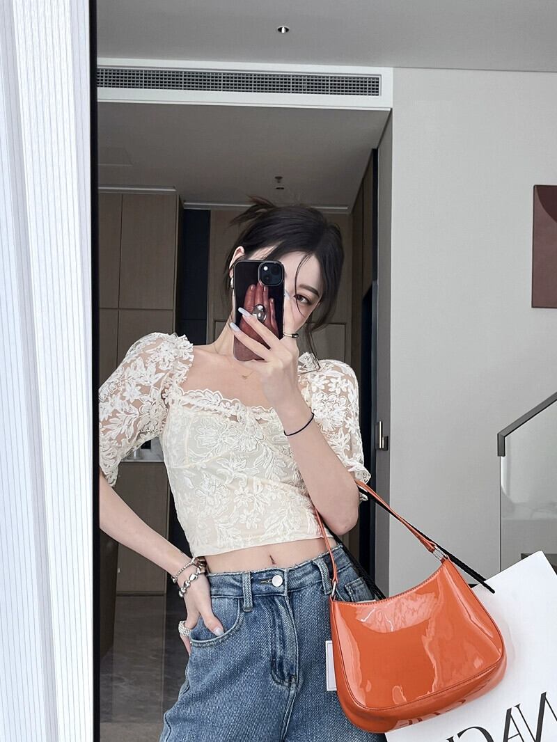 中空レース刺繍半袖シフォンシャツ女性の夏 2024 新しい純粋な欲望スタイルショートスリムトップトレンディな レッド サマー 夏物 ピュア S921959891693401