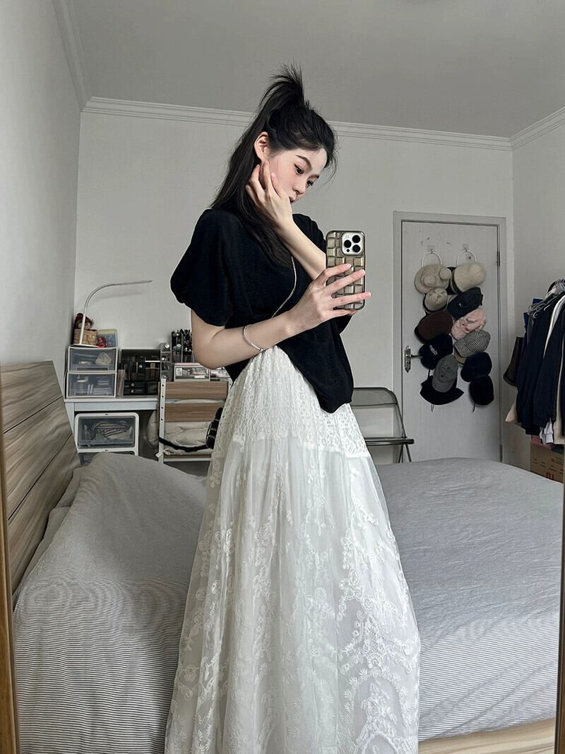 ルーズカジュアル半袖TシャツトップレディースサマースーツレーススカートハイウエストAラインスカート2点セット 夏物 S921910256541032