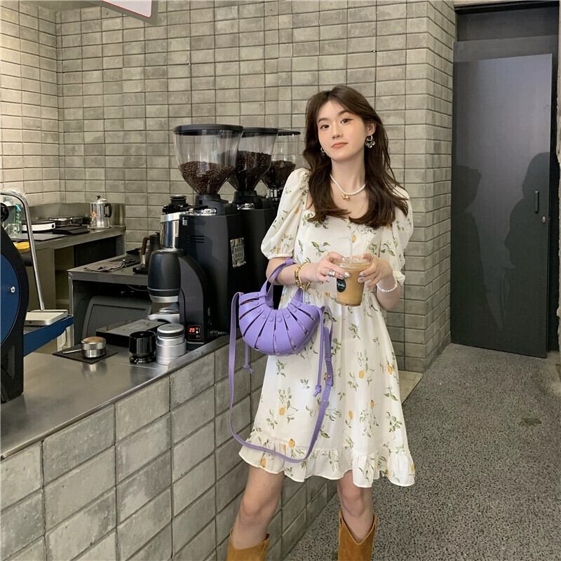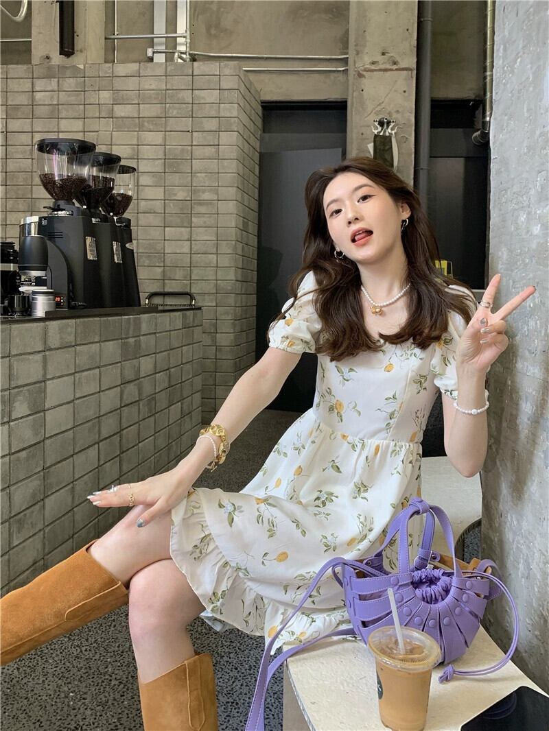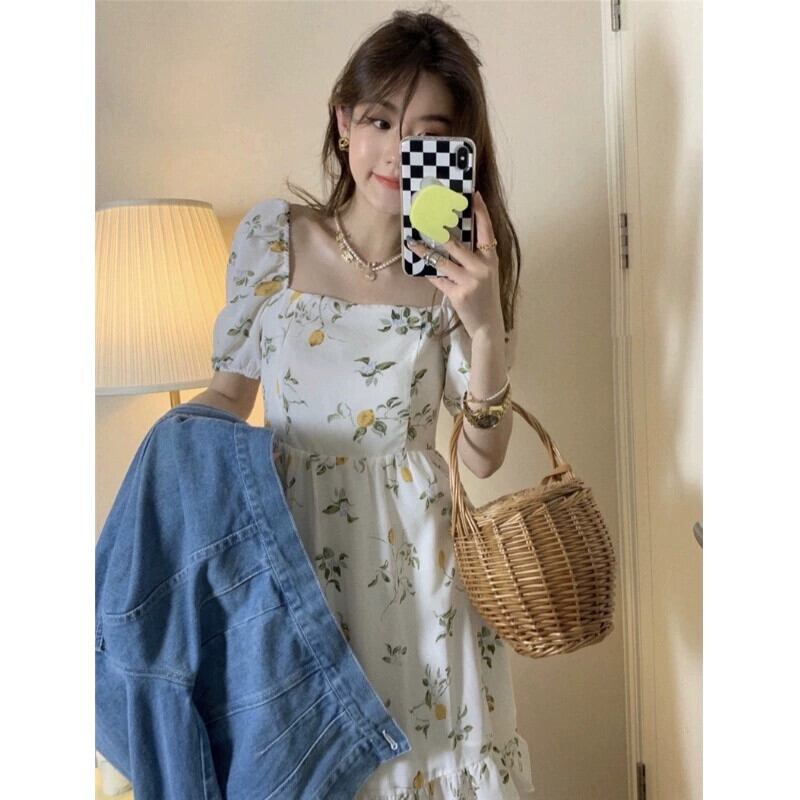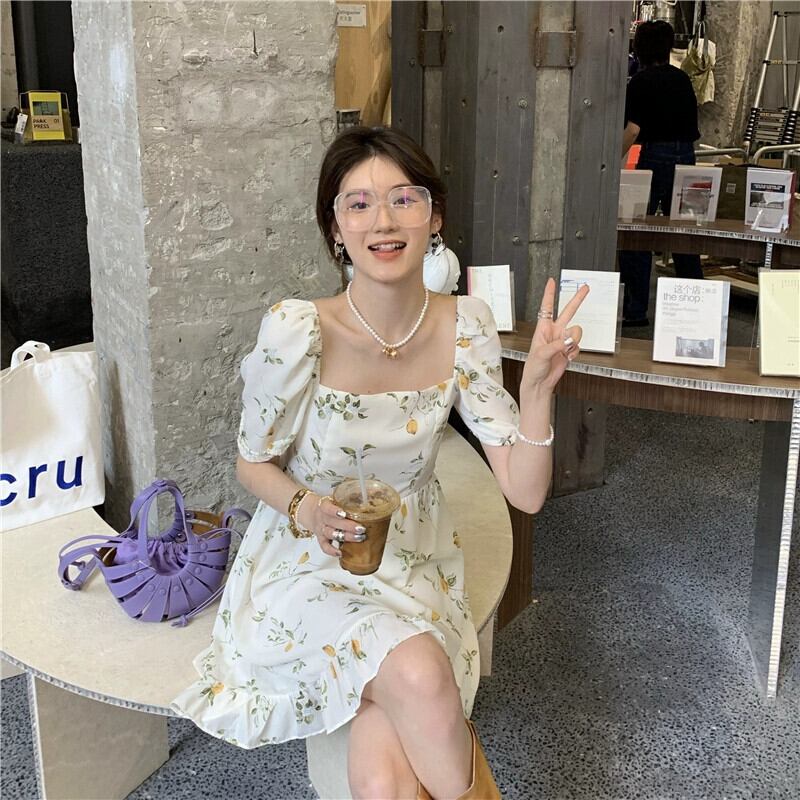 フレンチジェントルスタイルプリントパフスリーブドレス女性の夏の2024気質スクエアネックウエストAラインスカート サマー 夏物 スクウェア S921991948027786