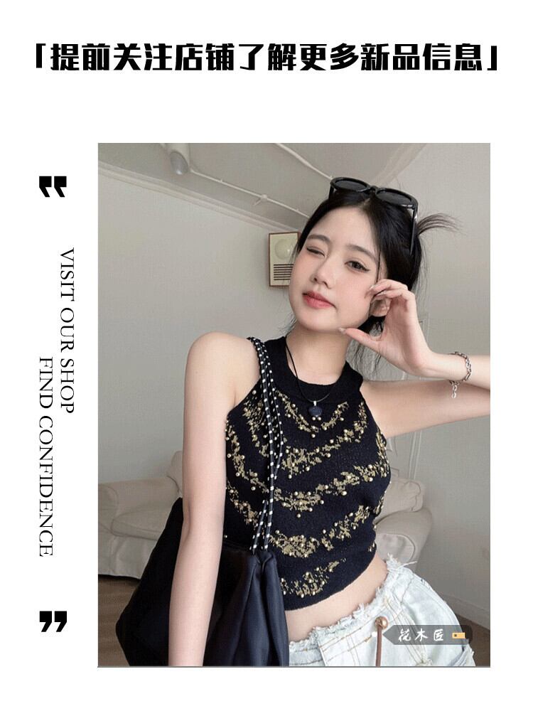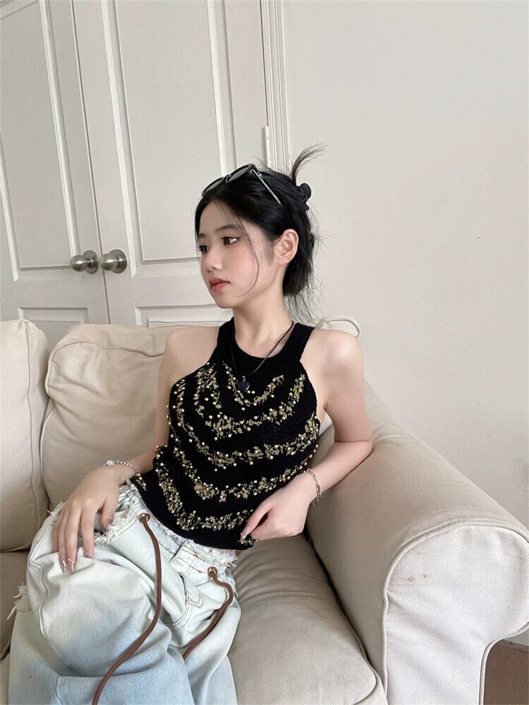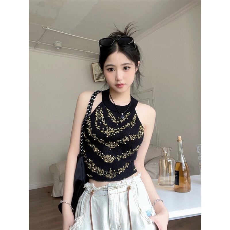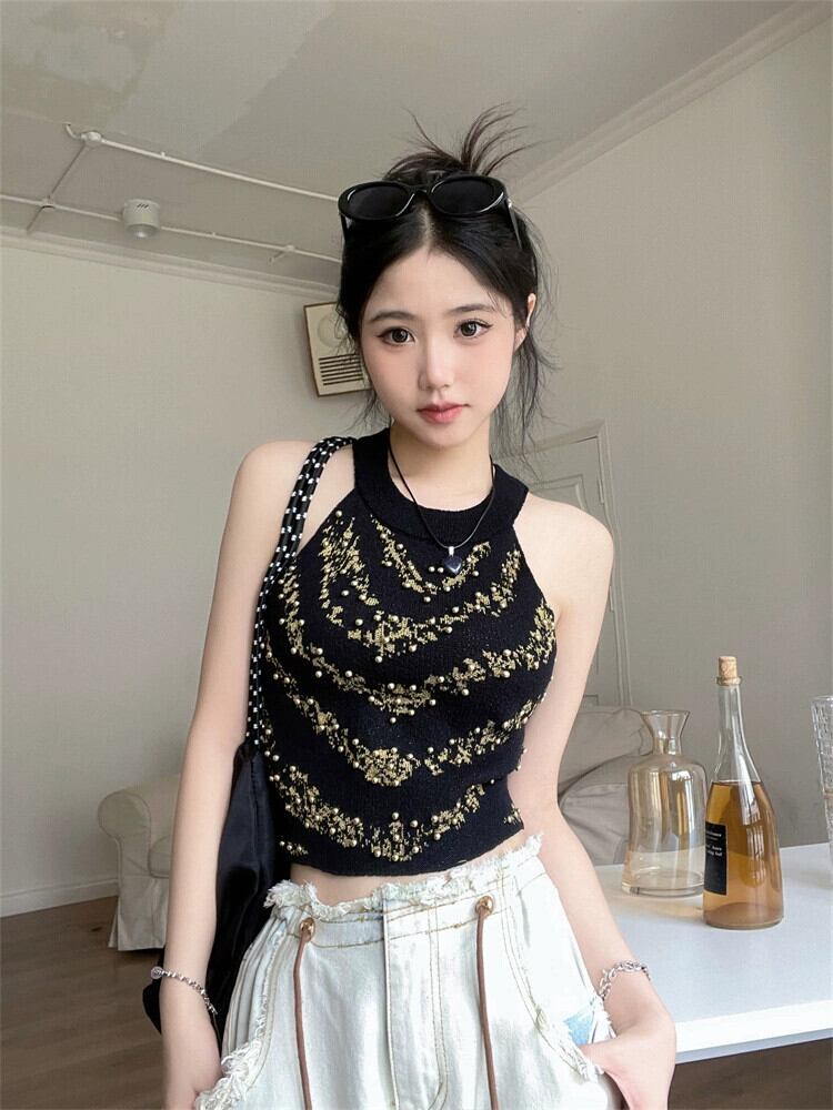 夏デザインのフレンチ ビーズ ビーズ ホルターネック ベストの女性、スリムなショート ノースリーブ ニット トップ 半袖 ハーフスリーブ サマー 夏物 S921911690417325