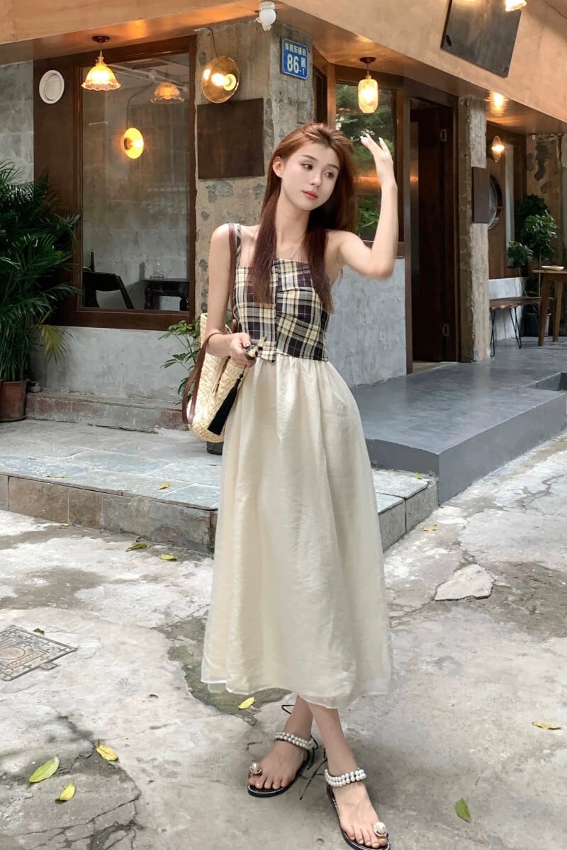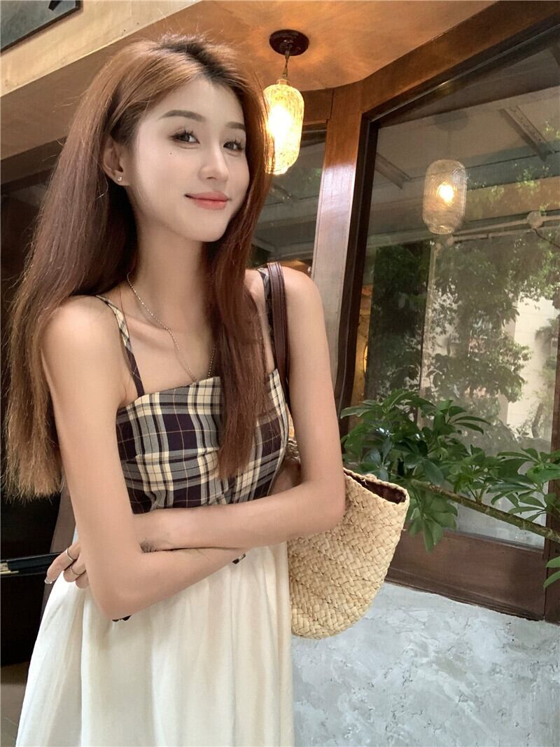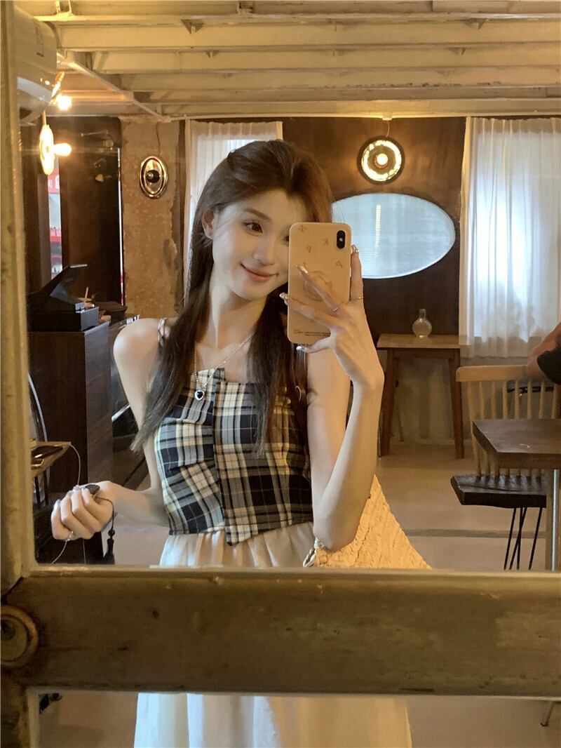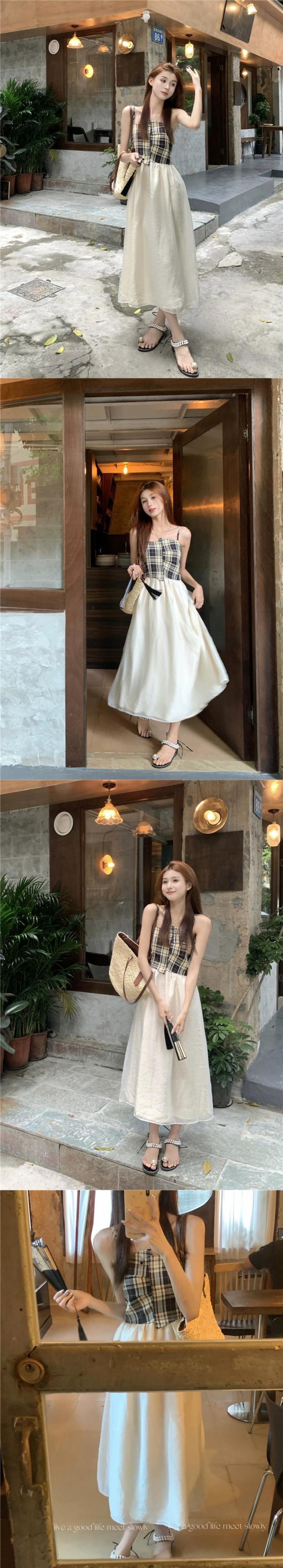 フレンチレトロチェック柄スプライシングサスペンダードレス女性の夏の 2023 新しいスリムフィットアウターミッドレングススカート サマー 夏物 S921974818950289