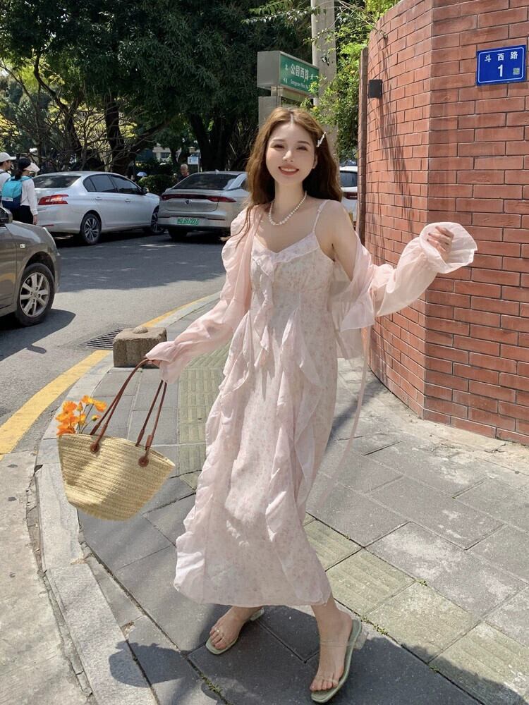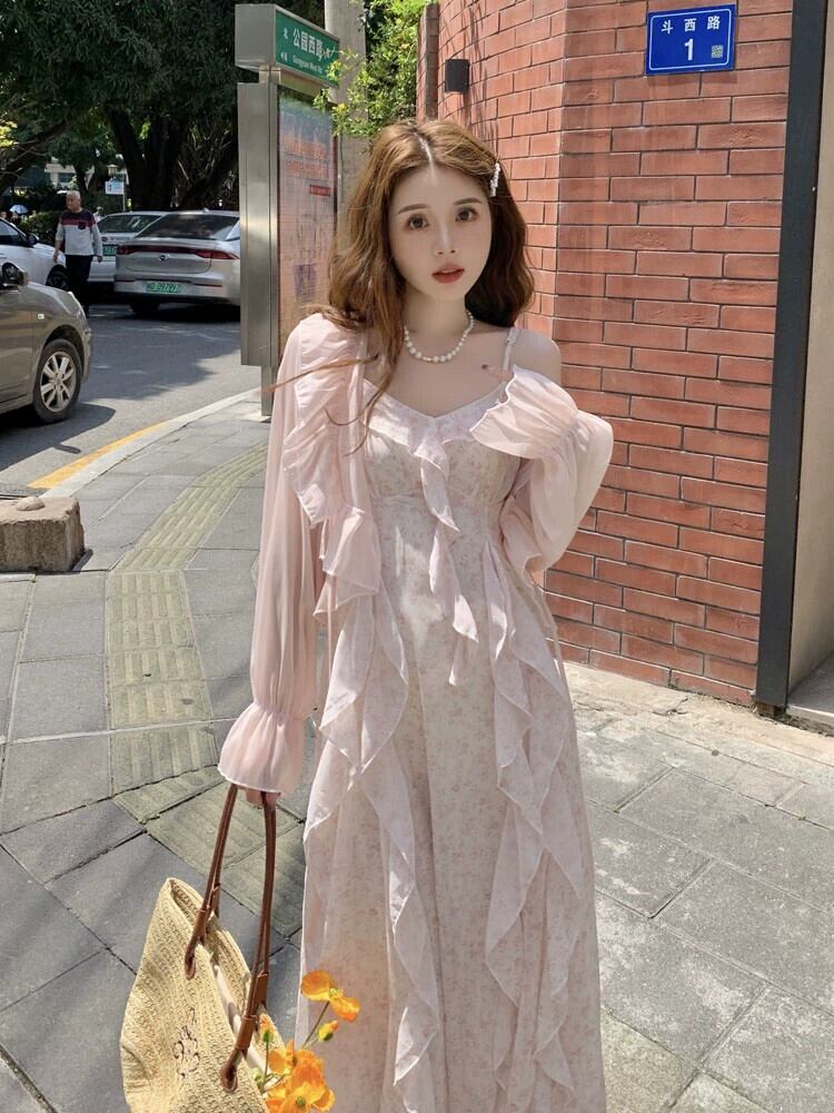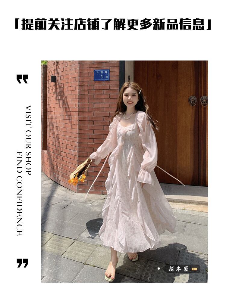 純粋な欲望のスーツの女性の長袖日焼け止めトップ夏 2024 新しいニッチフリル花サスペンダースカート 2 点セット ロング サマー 夏物 花柄 S921929584874543