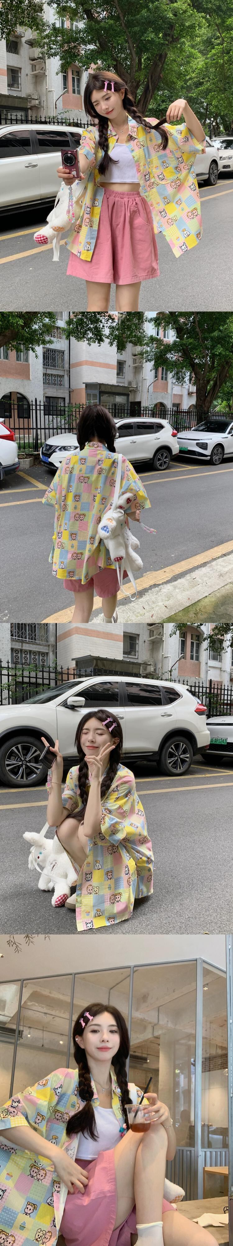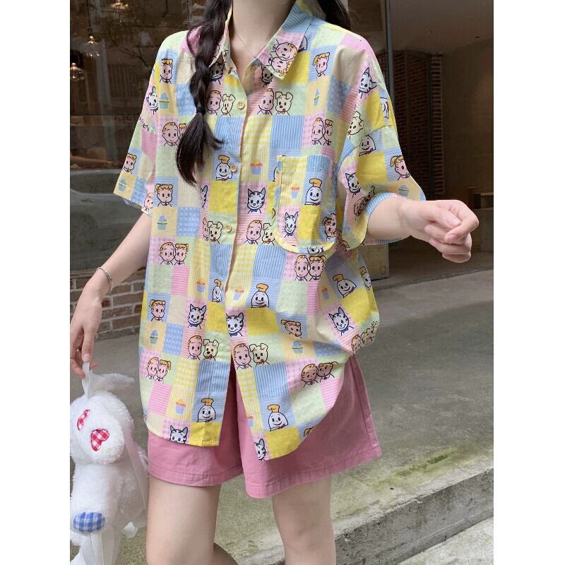 楽しい漫画プリント半袖シャツ女性の夏甘いネクタイルーズミッドレングスシャツ年齢を軽減するニッチトップス 大人ガーリー スウィート キュート カジュアル サマー 夏物 S921920694848280